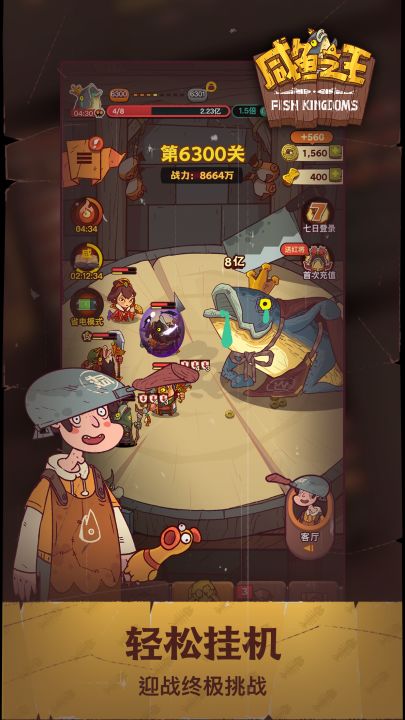 开发者的话做人如果没梦想,那跟咸鱼有什么区别 星爷的这句经典台词让我回想起了小时候的梦想, 小时候的梦想好像是当一名科学家。 小时候的梦想也许是拳打清华脚踢北大。 小时侯甚至幻想着长大,梦想着快快成为孩子眼中自由自在、无拘无束的大人。 可是我长大了,我没有成为那个科学家,清华北大也没有对我敞开大门。更甚于当时一起在游戏里叱咤风云的好兄弟们也难以聚齐,游戏里的头像都沉寂许久,失去了颜色。 我们失去了梦想,即将沦为一条咸鱼。 但即使做咸鱼,我也要做咸鱼之王! 生活让我们失去形状,但游戏仍会为我带来热情!因此我们立足于操作方式最简单的卡牌放置挂机类形式,希望唤起你心中的火苗,让你在无尽的生活中找到一丝慰藉,找到曾经的朋友,亦或是纯粹地成为有梦想的咸鱼之王。 放置挂机类的玩法不仅轻松简单,更是能利用起大量的碎片时间,打开后随手放在一边,事情忙完后,争气的咸鱼们又向前推进了数关,足以感受到咸鱼世界的魅力。打开手机无限推关,关闭手机也能领取离线挂机奖励,实乃上班摸鱼好去处!上千关卡,无数咸鱼,在蒸笼中,在煎锅里,在菜板上,战胜其他咸鱼成功逃脱或者成为菜板上的鱼肉,任人宰割,只有打通所有关卡,战胜邪恶,终能成为咸鱼之王。 美术风格上的别树一帜,更是让人耳目一新,放下疲惫。在咸鱼世界里遨游畅想,陪伴着五“鱼”上将披荆斩棘,克服万难。搞怪的风格,光怪陆离的装饰,拟人化的咸鱼,无不给予大家奔放的想象空间与极高的代入感,仿佛真的化身阿咸,渴望着咸鱼翻身。 当然,在放置的基础,在大家每天大概只有五分钟精力用来在游戏内点点点的情况下,我们还是希望能够找到当年一起熬夜的好兄弟,虽然大家没办法在现实生活中重聚,但却可以在咸鱼之王里成为邻居,一起组建俱乐部,继续延续生活的热情! 【注意事项】 非咸鱼,请勿入!