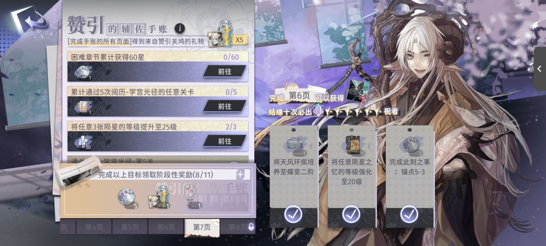 右下角那个赞引的辅佐是新手任务(手机旁边的) 天风环佩是必须练到2阶的,到2阶在新手任务领取返还给你的经验值和升阶自选,相当于白嫖一个2阶,而且低费坦度高好用 种地你是一定要玩的,种地玩到一定等级开厨房,厨房一定等级开供奉,供奉会加过关的掉落 助战你是一定要带那个新手送你很紫色的那个女的,助战效果是回费 不要羽化5星及以上的祝者,一个祝者可以带两把武器,但是不能带一样的