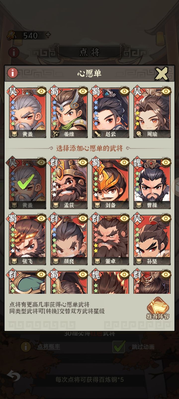 #攻略 作为一个已经玩了18天的时间的玩家,下面给大家介绍一下新手玩家前期需要注意的地方。1.阵容方面:一般都是选择董卓+吕布+袁绍+周瑜的组合。将这四个英雄设为心愿单之后,注意一定不要随便更换心愿武将,而且要谨慎使用武将的转换功能,这个转换一周才免费一次,换完之后就要过一周才能换回来,很麻烦(注意:这里的转化不是说你选的这个武将的碎片全部变成另一个武将的,而是两者的星级和碎片全都互换)然
