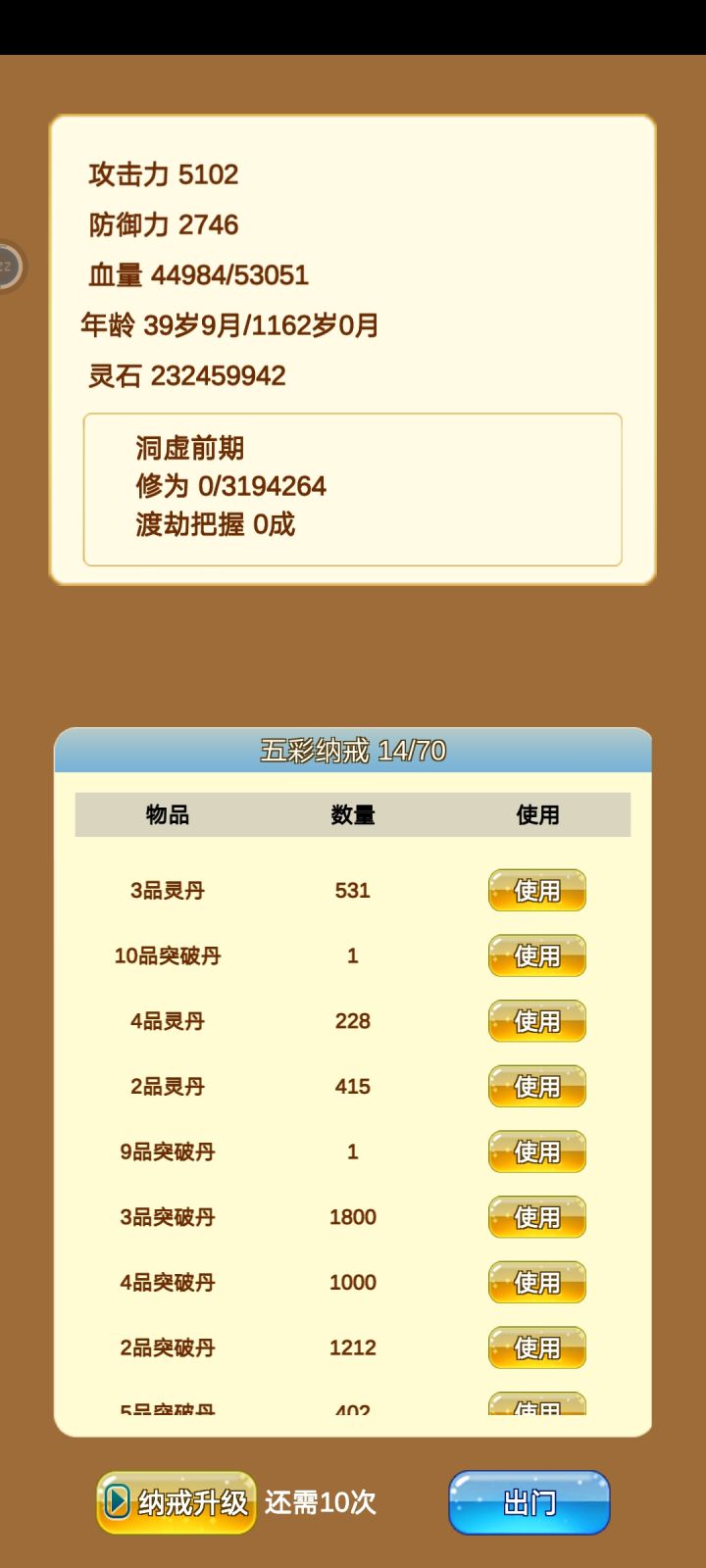 这个时候把财富控制在三万左右开始钓鱼可以刷坏人的钱,顺便刷刷拍卖场里面的纳戒,把背包扩充到20格,扩充完背包再屯几颗回血丹和狂暴丹或者硬肤丹,巨大丹加血上限没什么用,遇到筑基期强者,你破不了防血再多也没用。