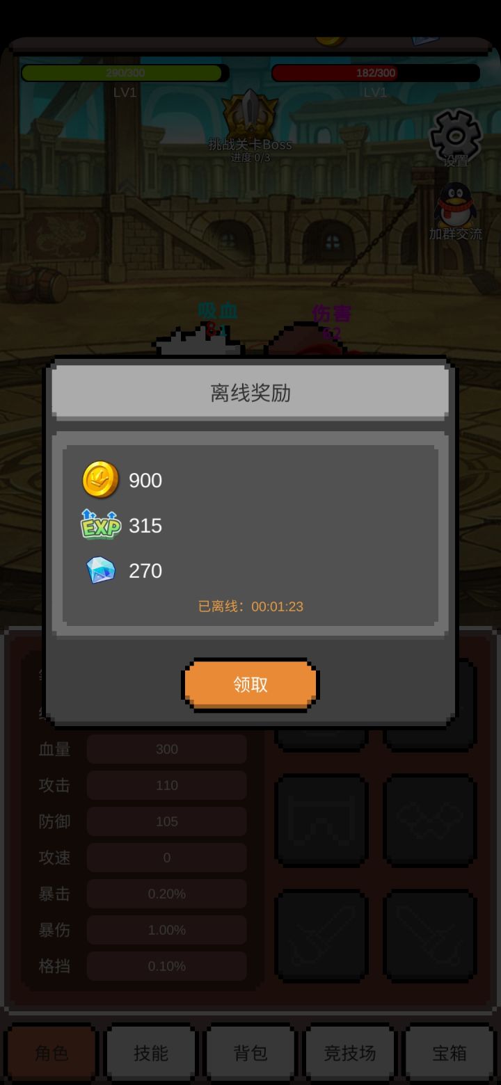 神之竞技场是一款十分简单休闲的挂机游戏,挂机技能随机释放,解放你的双手!在这里,你可以免费抽取、收集百种装备。每级宝箱爆率均相等,八大套装等你来集!挑战每阶竞技场擂主成就威名!!游戏的操作性偏弱,悠闲程度拉满。开局5000金币,变强全靠砍怪!!!①战斗玩法介绍:普通对手:前期可以优先加基础剑术提升攻击力,1-3级的怪物很脆就是给萌新们熟悉玩法的工具人,3级后有可能会匹配比自己的等级高的对