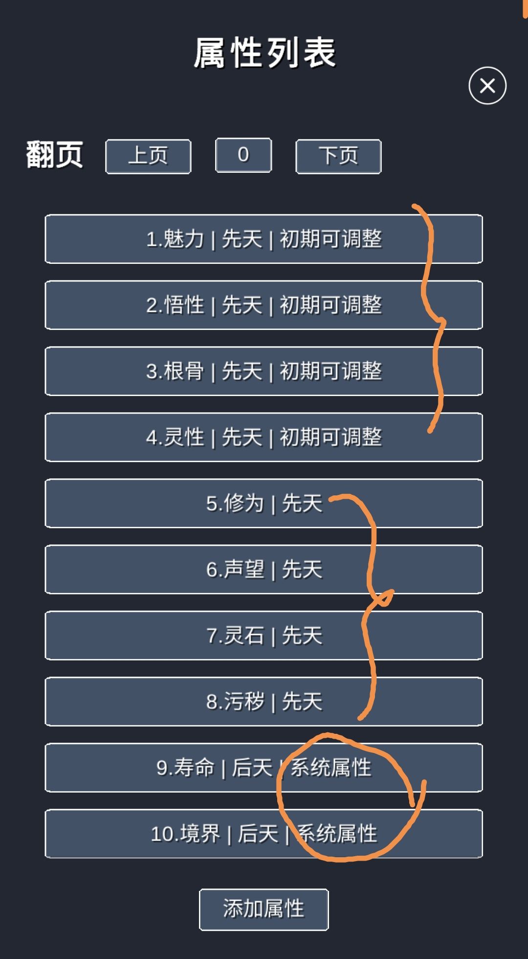 属性系统介绍: 1)先天属性。先天属性一共有8个,就是显示在开始游戏后你的人物属性栏的8个属性。 先天属性不可以删除,也没有办法增加。但你可以自由改变他们的名称。前4个就是你进入游戏时可以调整的四维,后4个在你开始游戏后,随着事件的进行而变化。如果你觉得自己不需要那么多先天属性也可以不定义,比如修改属性名称为“禁”,后续事件中没有这方面的属性奖励即可。 2)系统属性。系统属性主要有寿命和境界。二者