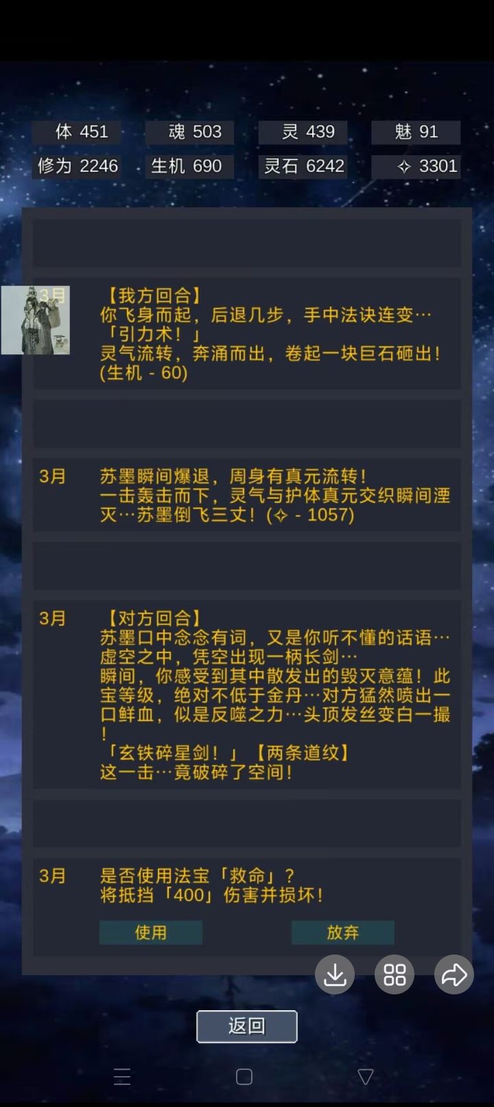 玄虚游攻略#玄虚游 #发现好游戏 #游戏日常 7.在宗门大战中,可以选择进入战场或退守大阵,不建议选择进入战场,进入战场要面对强度极高的明月子,并且打赢后还会自爆,大减属性,建议选择退守大阵 8.通过炼丹或通过完整的宗门传承,可以获得突破金丹的丹药,可以选择吃了后压制,额外获得属性 9.金丹突破分为普通突破,过去突破,九转突破,普通突破是最弱的,不建议这样突破,过去突破和九转突破的触发都需要时间