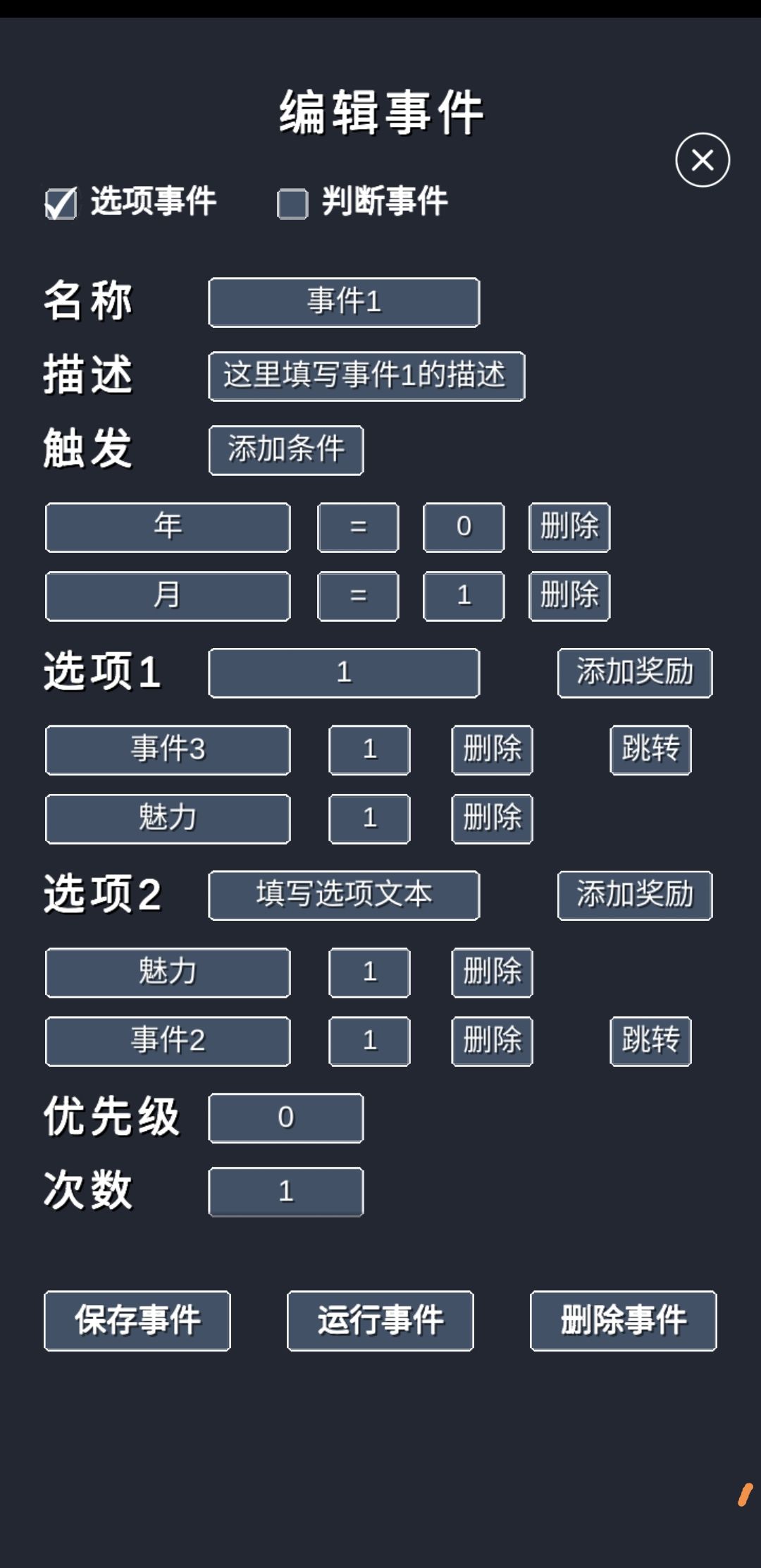 1.选项事件 我看我看很多人都不会创事件,就像这样: 怎么解决呢? 第一步:比如我们想设置的奖励是魅力+1,如图1,但你会发现这是不行的,如图2。相信很多人就因为这个给自己整破防,打算退游๑'ꇴ'๑吧… 第二步:我们要稍微给它改一下,就像这样: 画横线的位置你可以不用按照我的来,写其他的也没问题… 第三步:点旁边那个新建,进去后长这样: 在这里填写的奖励才是真正有效的,注意,它既不是选择事件也不是