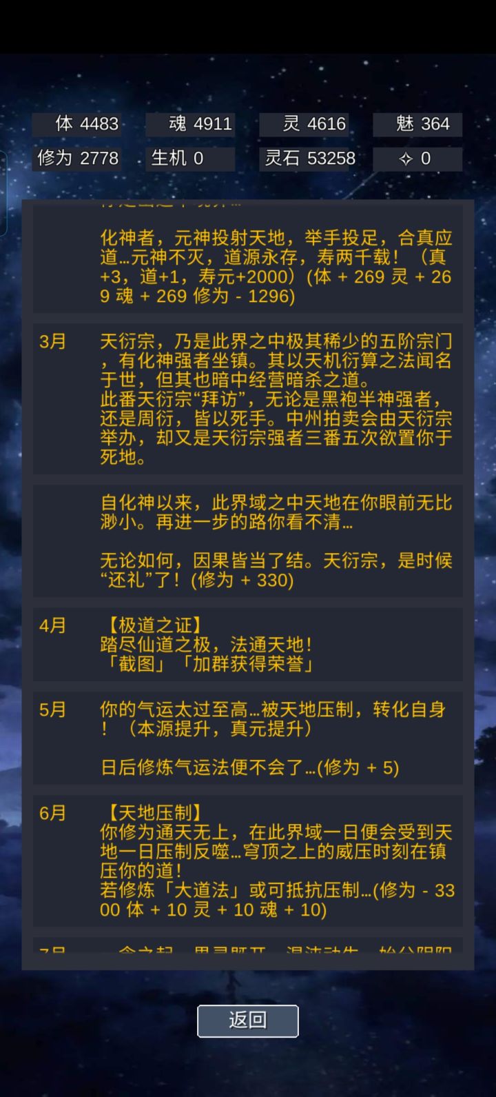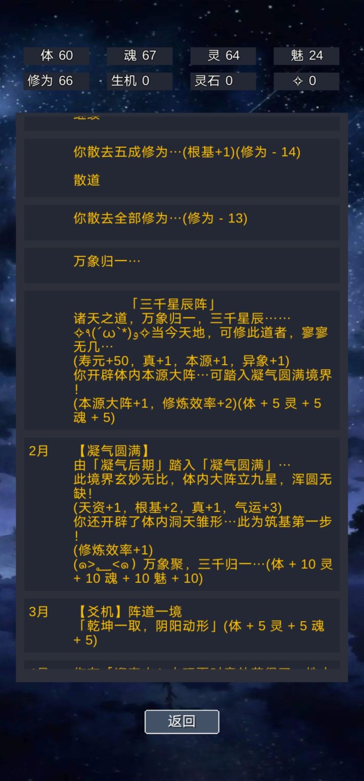先说一下开局吧 灵根:首选五灵根 五灵根可以拿五行阵和突破五行元婴 五行阵太强了 想肘过最好boss 就我体验来讲只有拉满的五灵根有机会 气运:不朽气运或超脱气运 没不朽和超脱气运拿不到五行大阵其他属性随意 第一境 练气五灵根开局 目标五行阵 突破事件不用压制 直接突破 先催动 再反转 突破成功后等散道事件 不要点散道 一直点维持 不朽气运的话要不了多久就能出五行阵 第二境凝气 凝气双极
