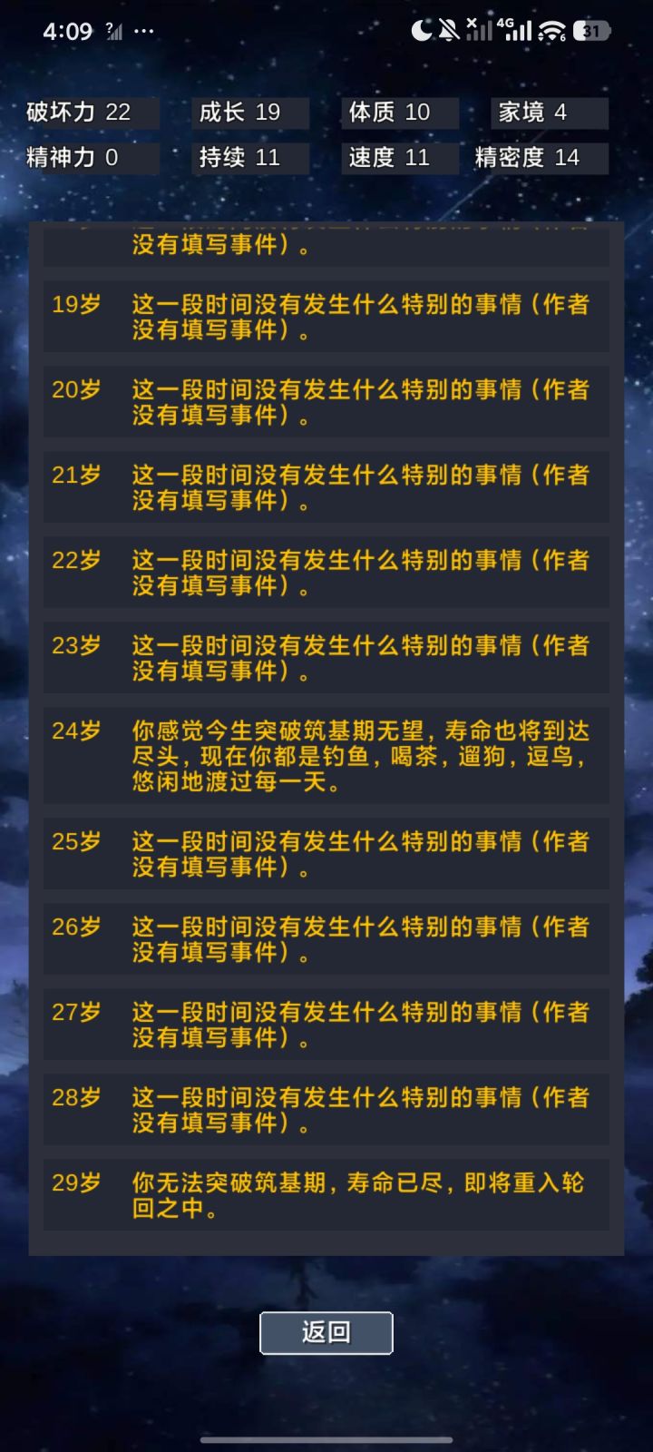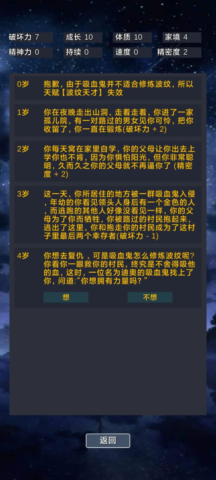 1. 开局加属性时尽量将两个属性点满,因为开始随机灵根之类的会扣除全属性5点,全点满可以得到最大加成。2. 更新通知看了之后会得到1296个灵石,灵石来得最快的一集。3. 十岁之前必须突破凝气不然会寿元枯竭。突破凝气只有5次机会,前四次可以压制,第五次必须突破。(先催动,再反转)若开局是天灵根或五灵根在全属性≥30可以点两次反转,之后选更进一步,后面全选左边,可以获得一个阴阳阵。4. 之后