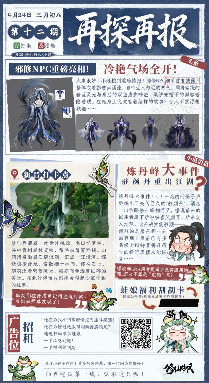 仙友们中午好!本期《再探再报》新鲜出炉! 邪修NPC首次曝光,神秘面纱下是冷艳的脸庞!新晋打卡点忆梦谷,摸鱼好场所!以及炼丹峰近日大事件!有人练出了失传已久的驻颜丸?速来和小蛙一探究竟吧~ 本期看点: ◆【仙界头条】邪修 NPC 首曝,冷艳气场拉满! ◆【新晋打卡】忆梦谷解锁,沉浸漫步仙境! ◆【炼丹翻车】驻颜丹翻车,现场笑料百出!关注本报,掌握最新资讯! -------------