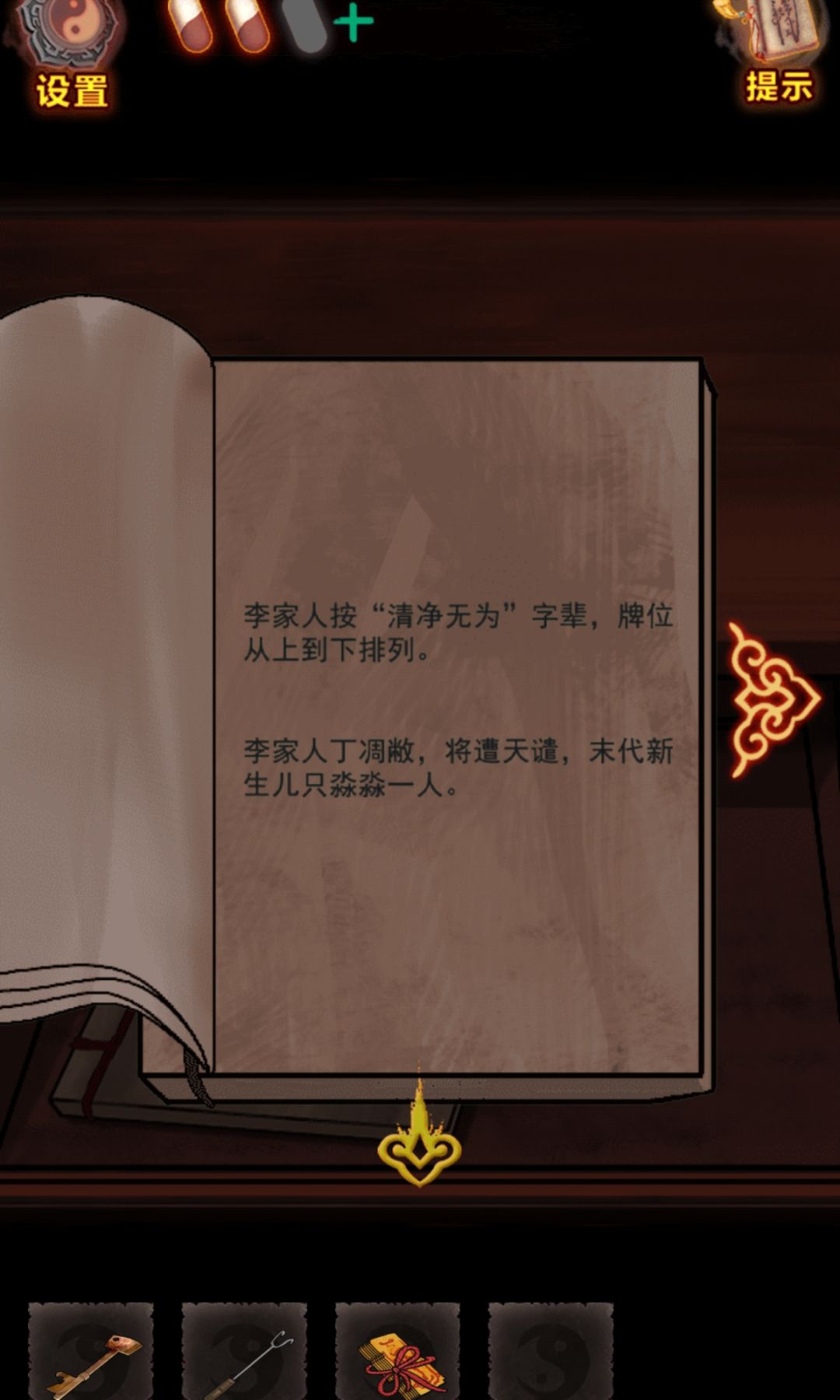 第三章:解封 1.(可为斋)在角落获得【长钩】 2.点击查看桌子上的书,获得破解阵法之法 3.(灵堂)在角落获得【锤子】 4.点击桌子左边的抽屉,打开,查看里面的书,获得线索:清静无为,牌位从上到下排列,童无忧正合字辈 5.在桌子上获得【空香炉】 6.(水塘)点击栏杆,获得图案线索 7.点击石碑,查看游戏说明,完成小游戏(火-土-金-木-水) 8.暗格打开,获得【凿子】,查看两张纸上的内容(李家人