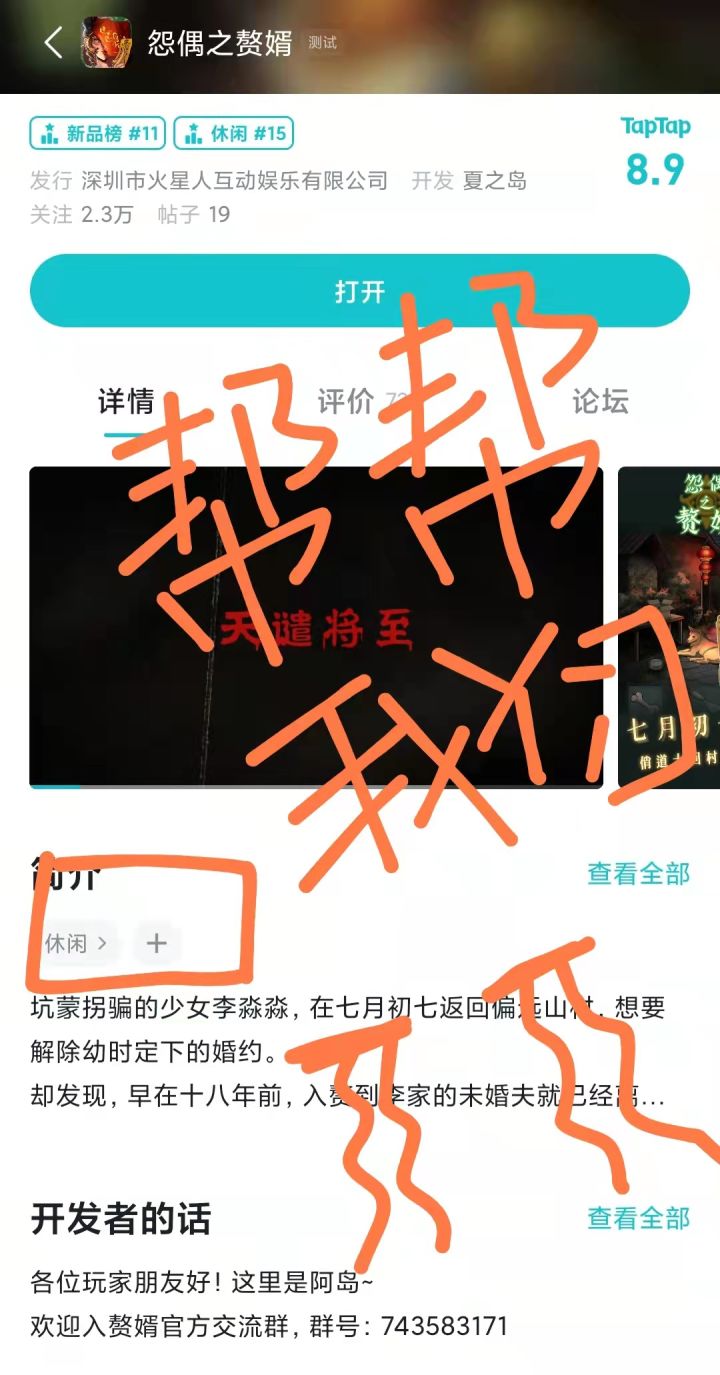 亲爱的玩家~帮帮《赘婿》吧!请大家帮忙加一下标签qwq加的人多才会显示,阿岛一个人加不上呜呜呜【解谜】【恐怖】【文字】这三个标签!(如果觉得赘婿不够恐怖的话,换成【国风】标签也行的~)球球大家了!急急急!o(╥﹏╥)o