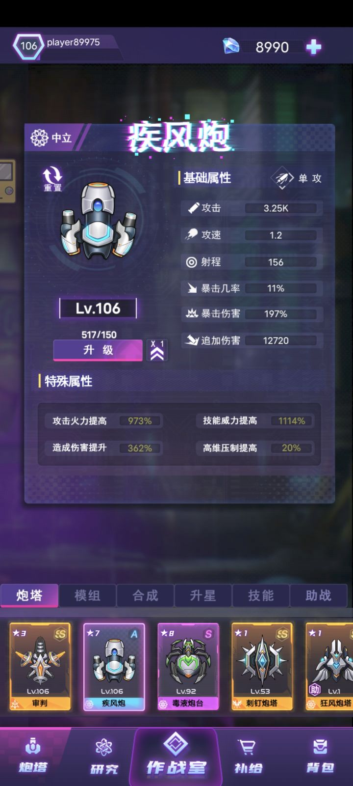 推荐一个不起眼的炮塔,疾风炮塔在前期单体输出极强,3星后就开始进入强势期,5星就不会比ss5星一些比较弱的炮塔输出低,我现在9天了疾风炮塔现在还是主C现在108级主线7200关,疾风炮塔输出靠的是50%几率造成1000%伤害所以模组需要触发几率,触发几率不超过100%都是有用的,还有就是疾风炮塔的获取比较容易,资源方面也没什么需求,等级之类的都可以重置,有了更好的炮塔可以马上换掉,也不会造成什么资