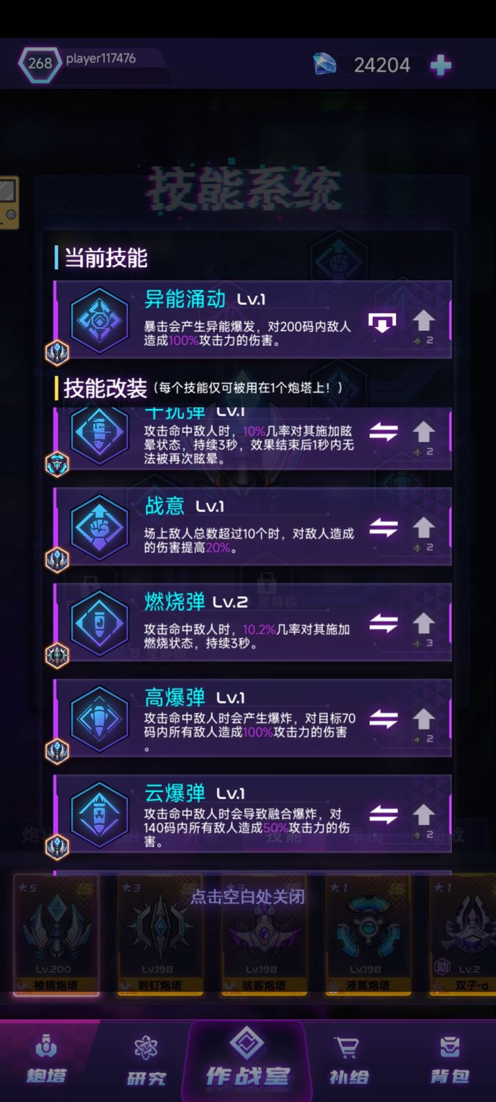 先说一下本人目前玩了3个星期,氪了200,无尽目前1.5w+,不是打不上去,而是懒得打了,感觉没意思了。好了进入正题。首先说一下我的阵容,棱镜,骇客,刺钉,液氮。目前我感觉最低阵容是刺钉,液氮二选一,骇客可以随意替换,棱镜可以刷人人都有就不用换了。阵容不用纠结因为阵容不重要,重要的是技能。炮塔装备技能两个必备一个战意,一个燃烧弹;战意给棱镜,燃烧弹给刺钉,有没有战意伤害天差地别,战意的描述应