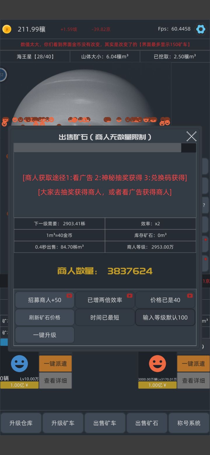 矿仓容量没次升级的上限可以在加一下,现在拉到最满点一下加0.01,开连点器点了半天一共才26.多,还有矿仓容量升级后没反应,得重进矿仓容量才能刷新