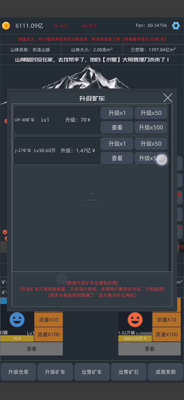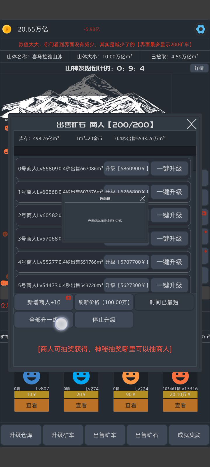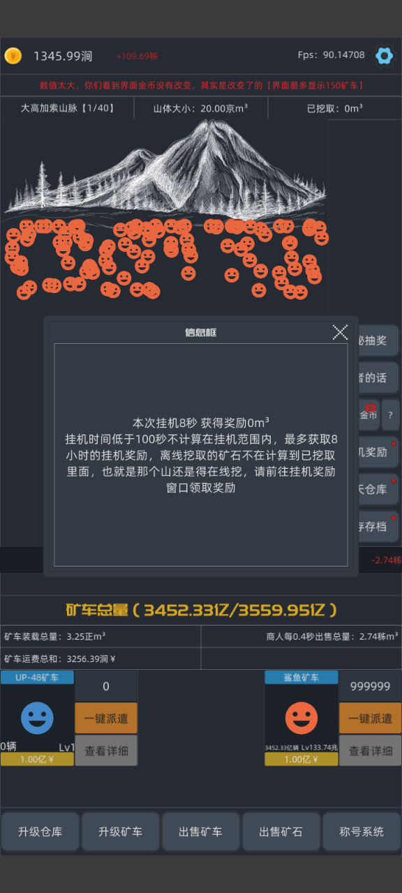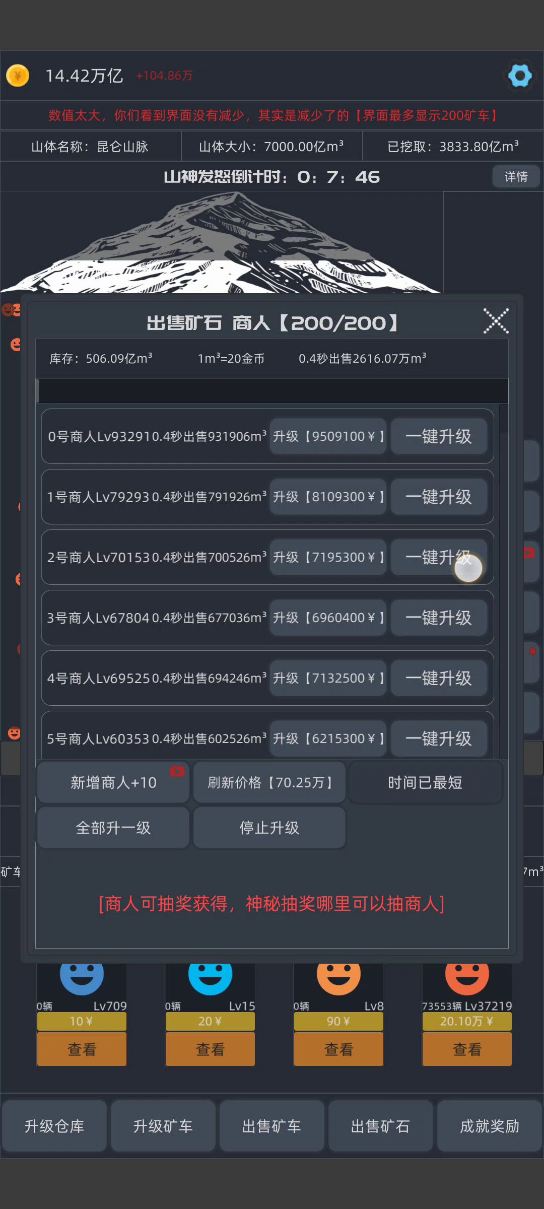 作者,我688亿没0.4秒出售,1个是20快,应该是0.4秒13700亿左右,但是我钱大概是6800亿左右。 一兆是1万亿,我应该是一下跳1.3兆左右啊,就算有矿车和商人消耗,但也不可能一下消耗6000亿啊,作者修复一下这个bug啊