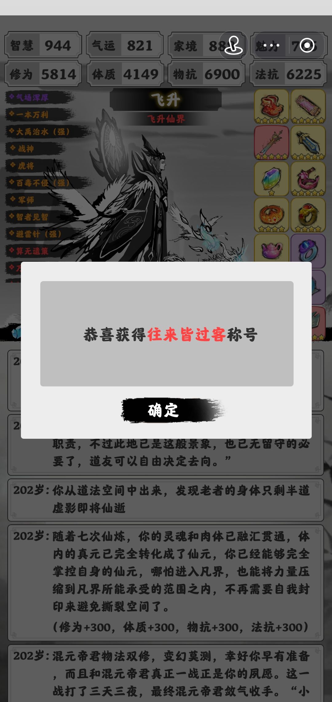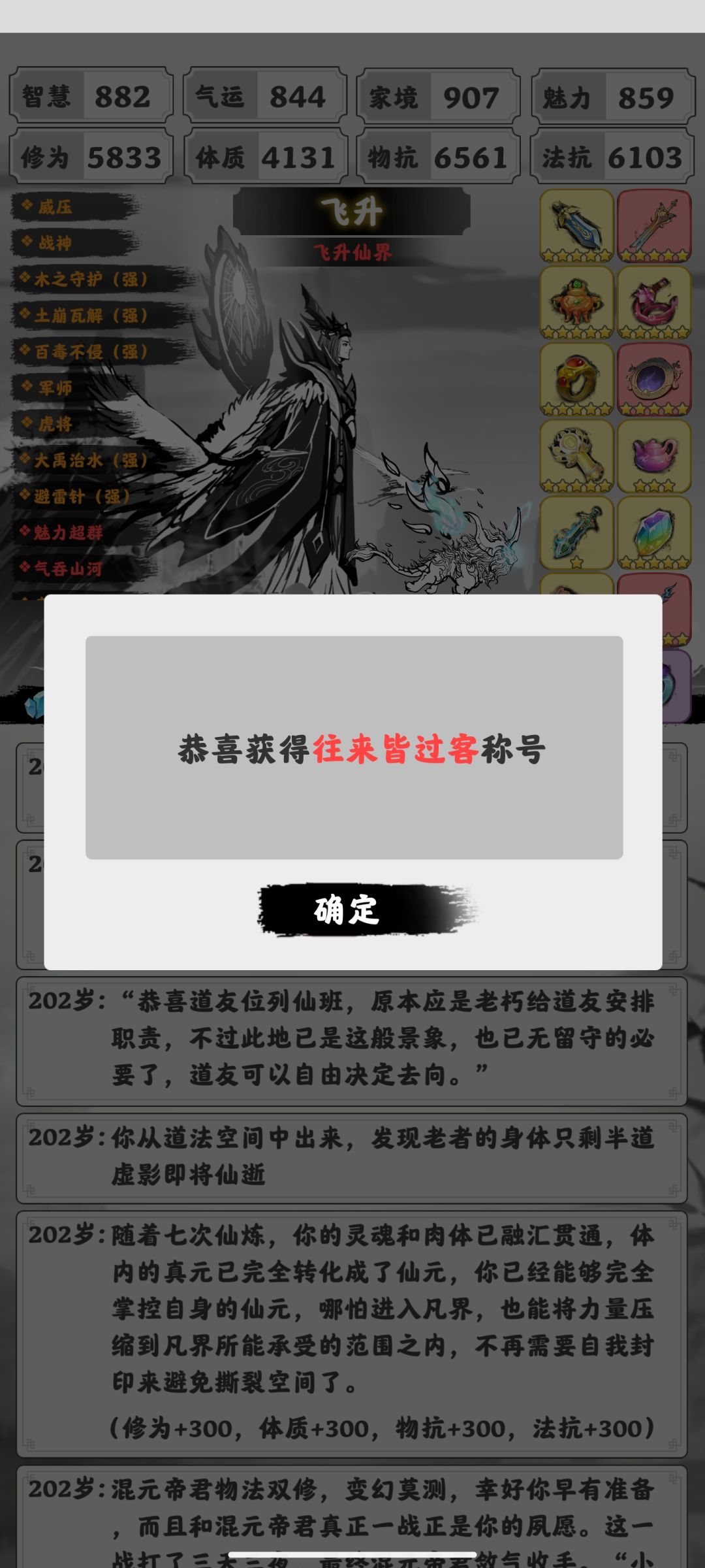 新手攻略,仅个人玩法分享,大佬别喷。 1. 我把智力,魅力,运气+8(触发支线用的,高的话还会有人送紫/金装给你),剩余全投入家境(生钱) 2. 称号选多属性免疫的就好,蛐蛐可以找胖子拿了。开局直接刷盘古斧(加体质的机遇再+1),先熟悉所有选答题保证每次答对(多数是等人救援,正义/单纯的答案,有实力也可以亲自动手) 3. 开局后先尽快买到打神鞭和轩辕剑并升至4星以上,这可以保证渡劫还是对战有足够的