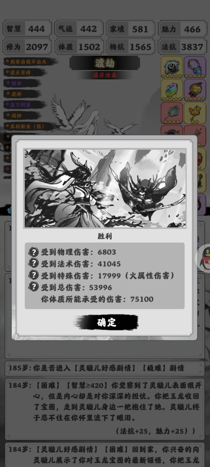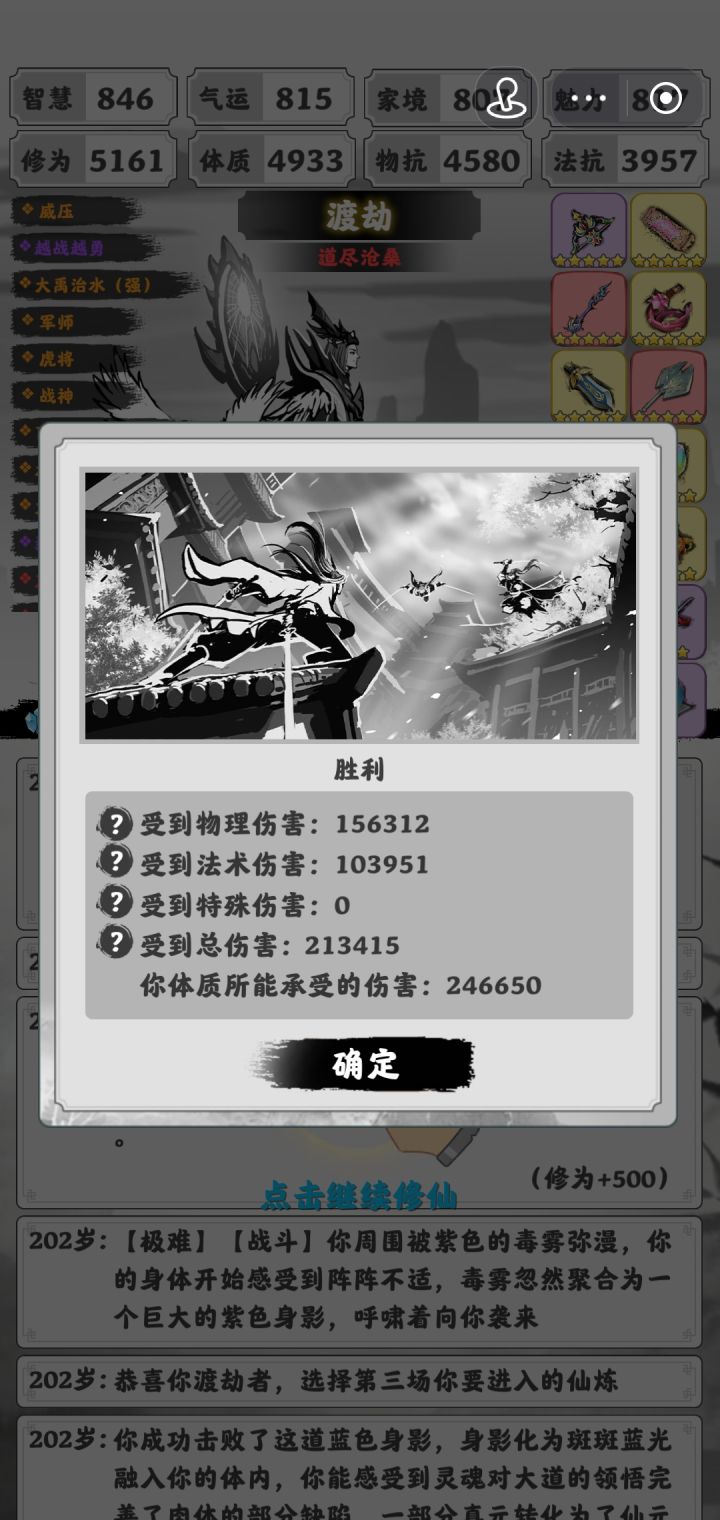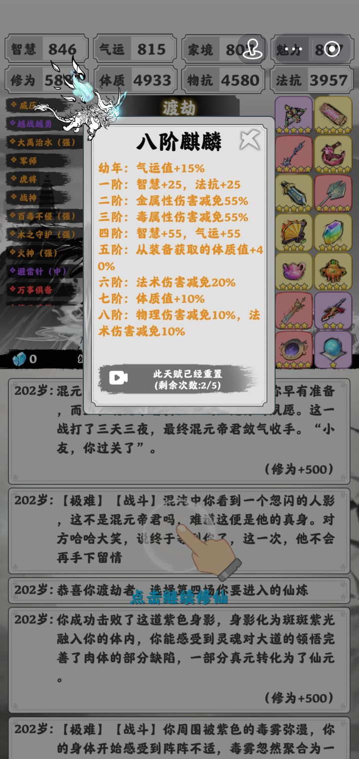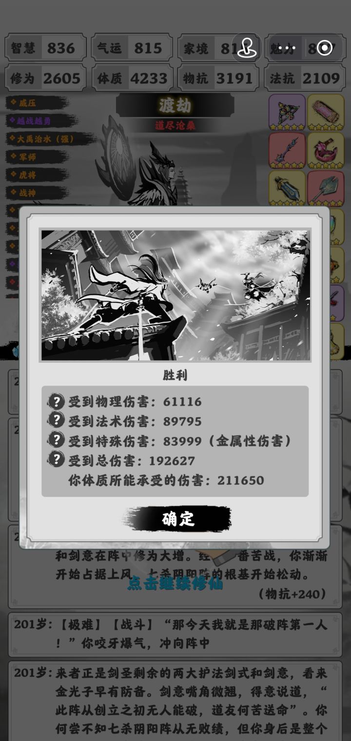 终于在群大佬的帮助下做出来了,写下了此篇攻略。必要剧情选择:发现女儿用回复术选2找璇儿,185进极难,201偷袭剑台。开局选择自由蛟龙璇儿,称号道尽,加点多加家境,璇儿会很缺钱。扇子开局,看第一词条是智慧的话补家境鞋或者走灵阳,是家境的话,我们直接走进丹墨。剑二三丹王水月镜的事件老生常谈了,最好都有,有俩就够了,反正多出少吃词条。做两法抗紫,中期自由出法抗装和体质剑,补天石优先一些(家境