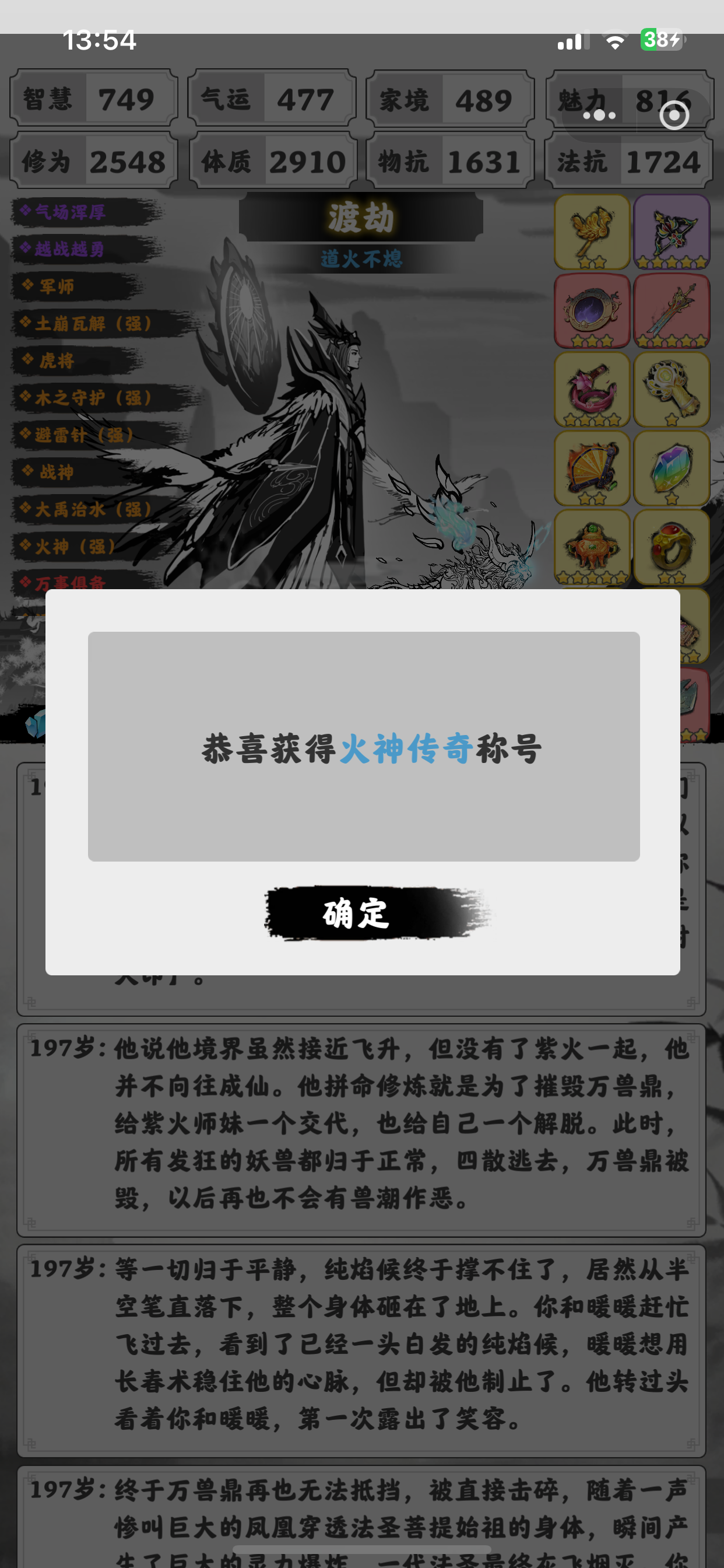 综合了论坛各路大神的攻略,断断续续玩了4天几十个小时拿了道火,先说一下整体游戏思路。第一把就当新手教程来玩,等有一些好的称号了,就去做书仙,用书仙开始反复玩,直到飞升拿到仙路漫漫,能顺便拿万法归一最好。然后就是仙路漫漫前期真的好用,带上它和悠雅老婆做百变圣女,很好做的,注意一些关键时点的属性判定。百变圣女之后可以做七星神兽和剑圣二十三了,这两个一般都是做一个顺便完成另一个,只有稍微凹一凹就行