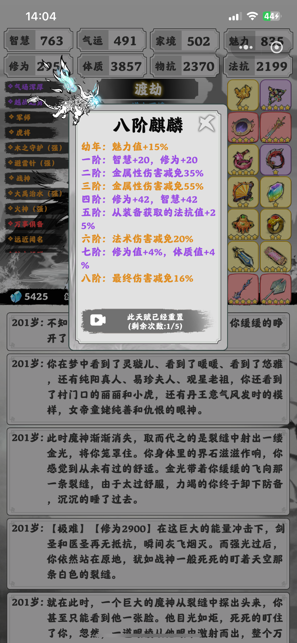 渡劫模拟器自由和统治性格区别 :性格:自由、统治,分别会给两个初始天赋,一个紫的一个橙的,都是用来触发剧情用;自由:(逍遥叹,我命由我不由天):前四岁会触发 (气运和法抗)的剧情,80岁以后会触发 (智慧和法抗)的剧情.统治:(气场浑厚,威压):前四岁会触发 (家境和物抗)的剧情,80岁以后会触发 (魅力和物抗)的剧情。麒麟跟蛟龙的区别:1、属性不同。蛟龙 是家境和智慧,多金木水土免伤