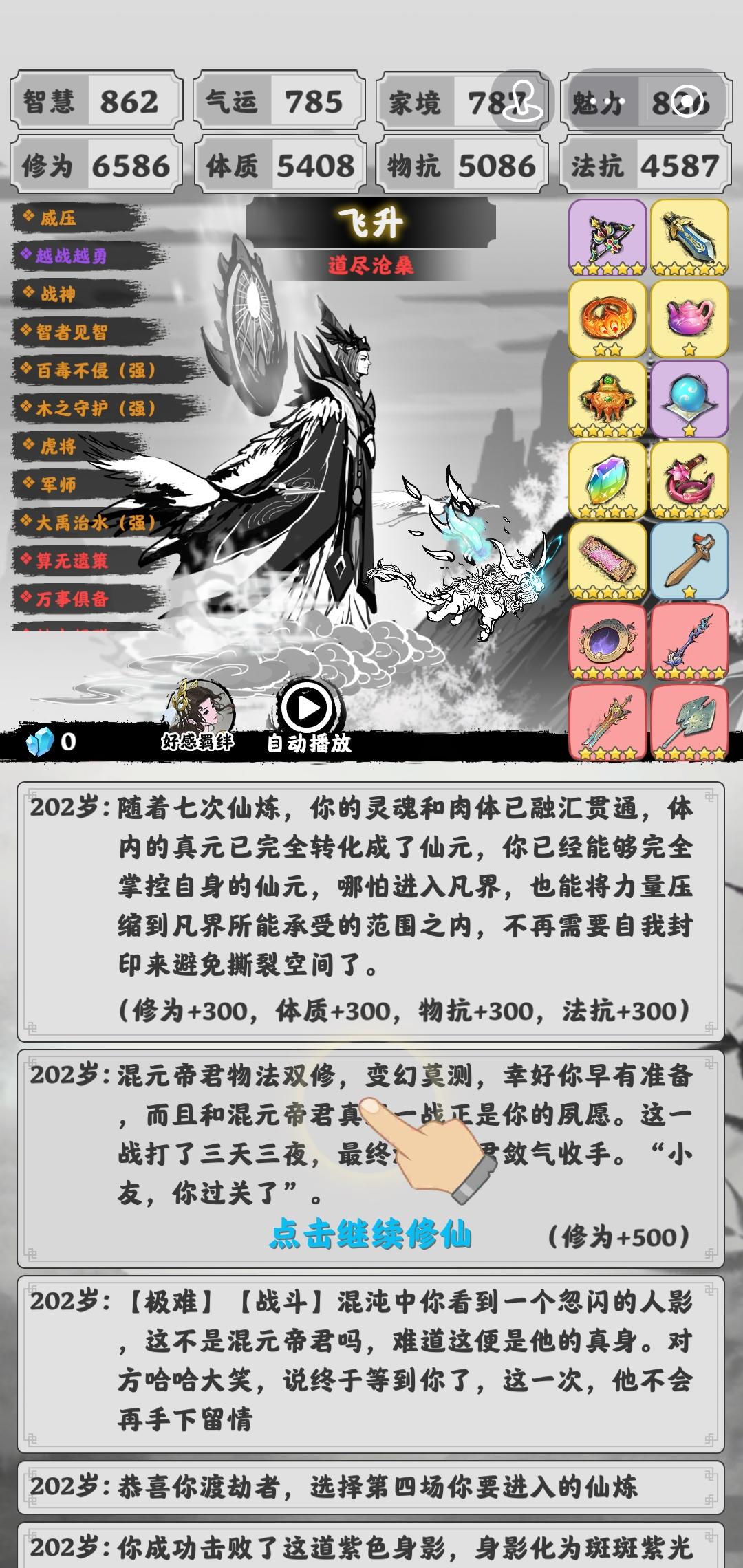 5、飞升要修为1630+,有人也说是1640,但是有次我飞升失败后,1632的数值可以再来。200岁之前必须飞升,否则就等死吧,飞升对体质数值有要求,具体没有统计,选项我都是第一个,不排除还有其他路径。最终决战除了物抗法抗上千的大乘,还是建议飞升。