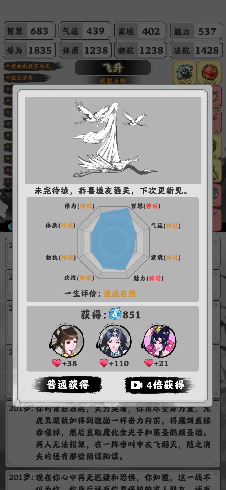 5、飞升要修为1630+,有人也说是1640,但是有次我飞升失败后,1632的数值可以再来。200岁之前必须飞升,否则就等死吧,飞升对体质数值有要求,具体没有统计,选项我都是第一个,不排除还有其他路径。最终决战除了物抗法抗上千的大乘,还是建议飞升。