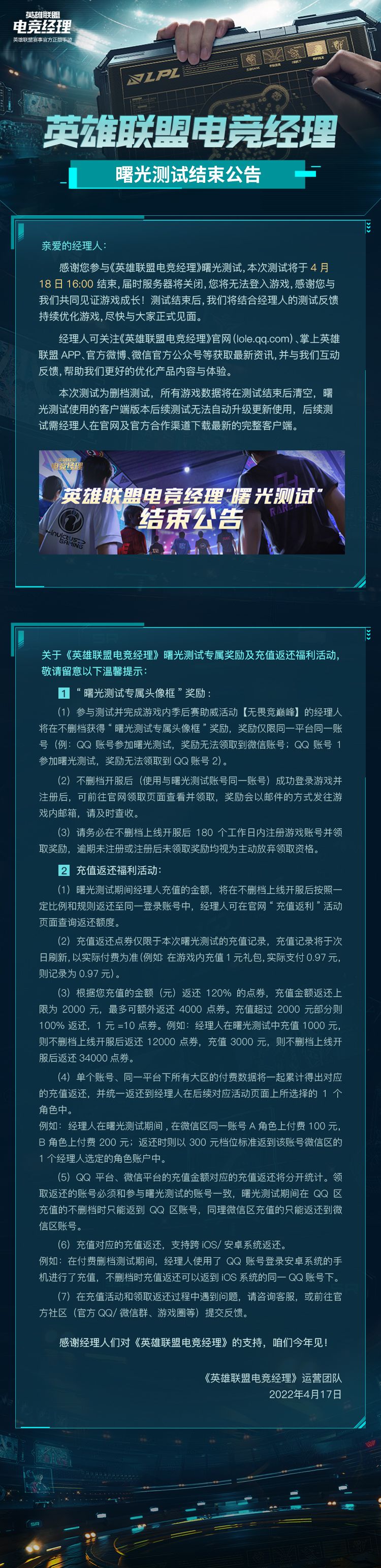 亲爱的经理人,《英雄联盟电竞经理》曙光测试将于4月18日16:00结束,感谢您与我们共同见证游戏成长,期待下次再见!