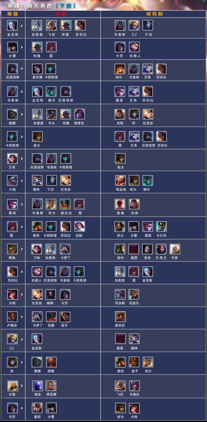 大家好,今天带来的是盘点比赛中各路英雄之间的克制关系——下路篇,也是最后一期啦~相信小伙伴们都明白BP的重要性了吧,不知道沫酱的整理是不是给大家带来帮助了呢?接下来送上下路英雄在游戏中的克制关系,大家收藏起来吧~ 英雄克制关系系列沫酱已经全部更新完毕,有需要的朋友们自取吧,感谢大家一直以来的支持!上路篇、打野篇、中路篇、辅助篇及更多攻略戳我头像进主页了解~