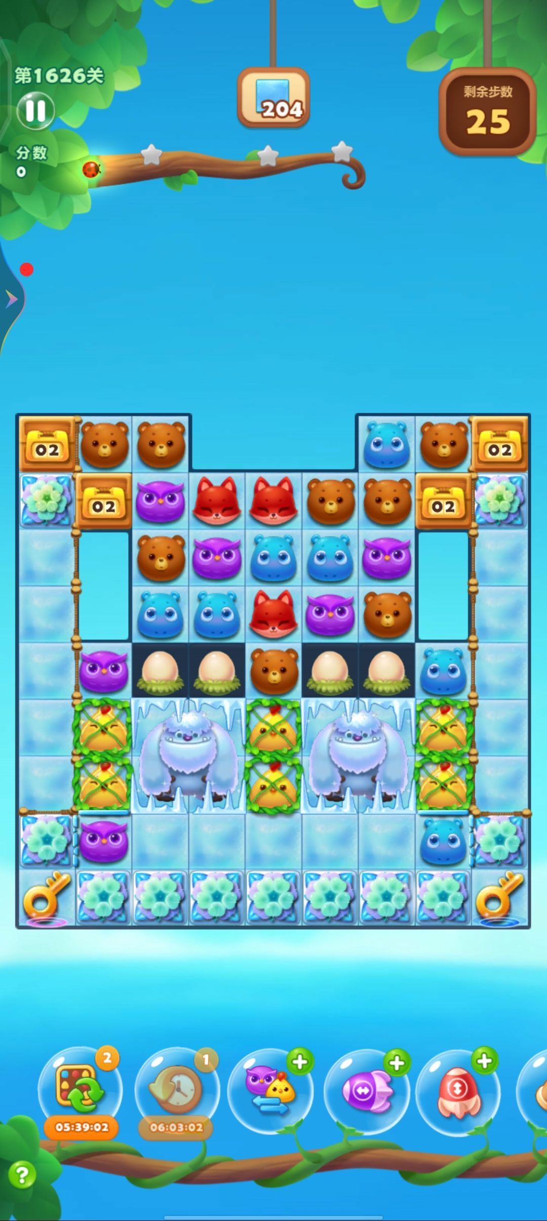 我好像发现了这个游戏的通关小窍门,只要一直消除目标旁边的小动物就行了,就算是消除满屏冰块,只要从下面开始消除,基本上都可以通关。