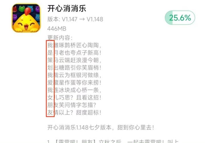 近期,经典益智游戏《开心消消乐》官方微博发布了 12 周年版本的全新活动,这本是一次常规的游戏更新,并未引发过多关注。可到了 4 月 10 日,有眼尖的网友意外发现,这次的版本更新内容里暗藏玄机,里面藏着程序员写给女友的浪漫情书,相关话题随即在社交平台走红。这并不是《开心消消乐》的开发团队第一次用游戏传递甜蜜心意。网友还翻出去年七夕的版本更新公告,公告文字里藏着一首精心设计的藏头诗,将每一句的首