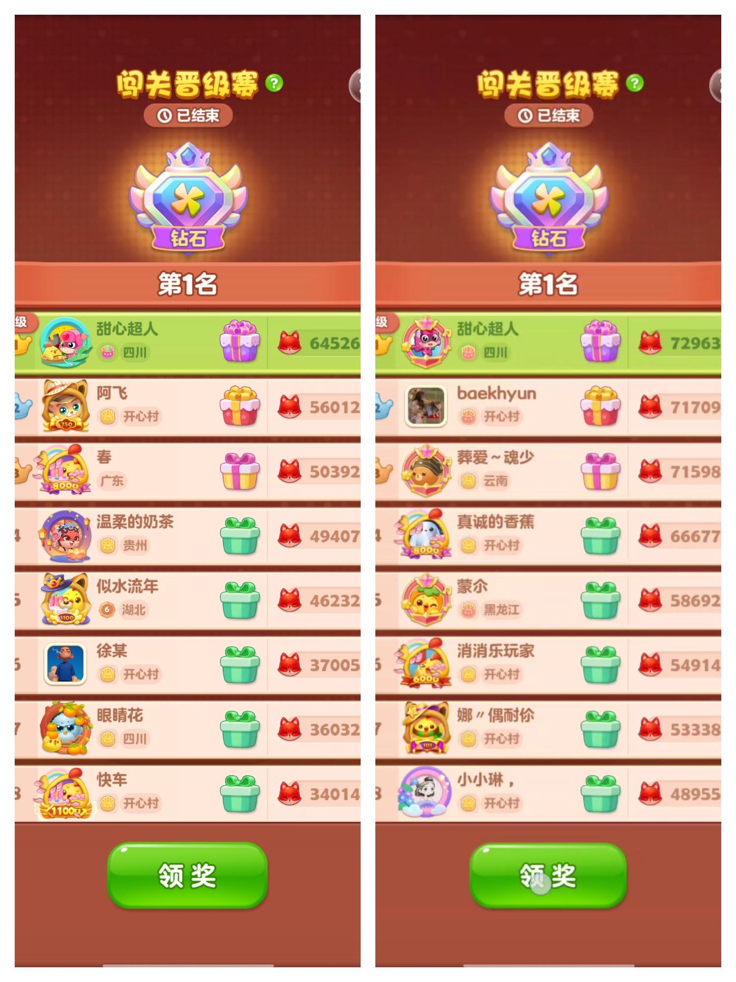 #开心消消乐 #成都粉色3号线 又是一次双冠,左号一帆风顺,右号却十分坎坷。值得一提的是,左号第35、105、115、125期都是小组第一,135期又是,这仅仅是巧合吗?图2、图3:虽然右号收集物均略高于左号,但这期晋级赛左号只打了75关,右号却肝了126关。周四晚上,我打完左号晚间奖励后,王者争霸赛和晋级赛应该是稳了,但我通过名片发