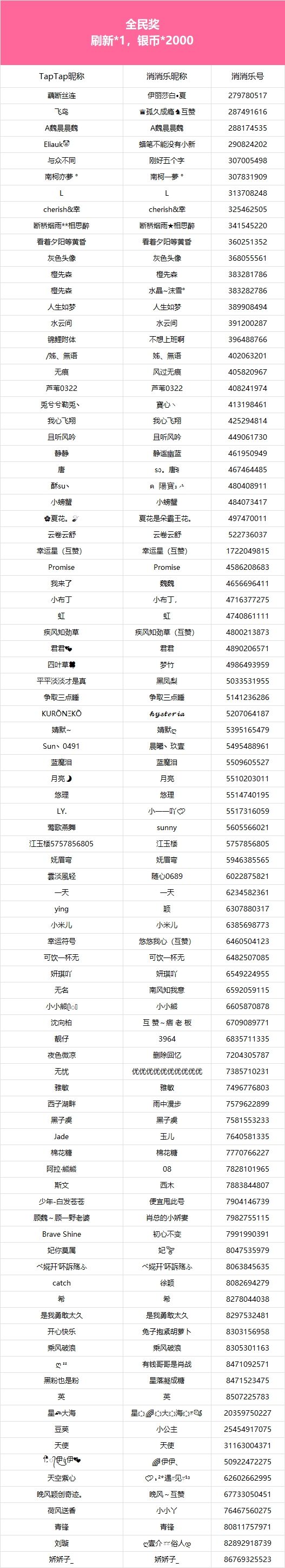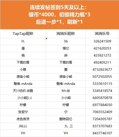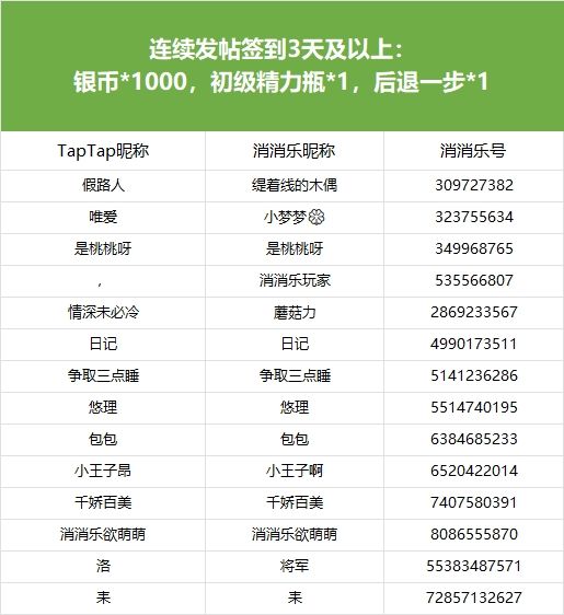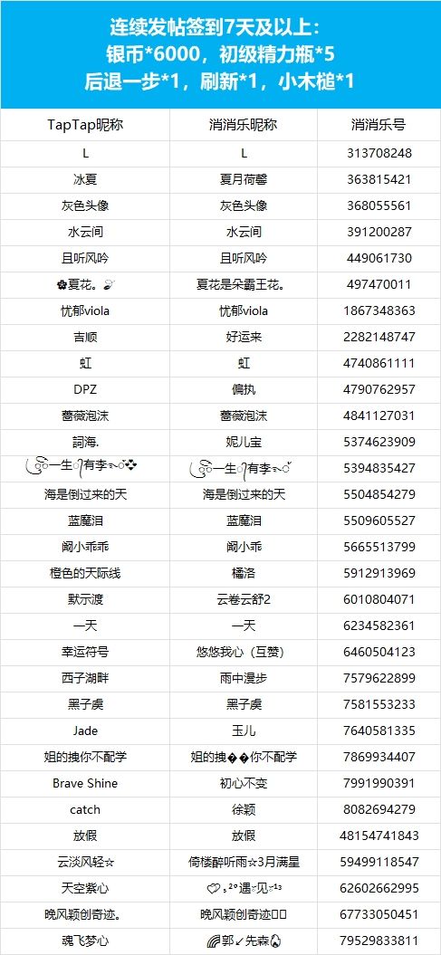 【争做连胜王,每日打卡赢大奖!】活动现已开奖!恭喜获奖的各位小村民!本次活动道具奖励将在7个工作日内通过游戏进行发放,周边奖励将在30个工作日内发放,感谢您的支持与理解,之后也请多多支持消消乐(づ ̄3 ̄)づ╭❤※活动地址:https://www.taptap.cn/moment/588775503591112719
