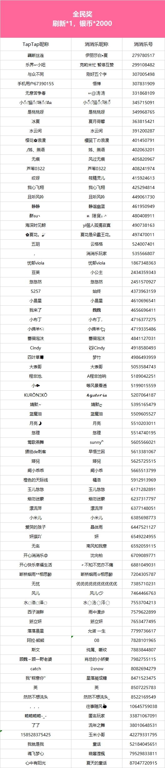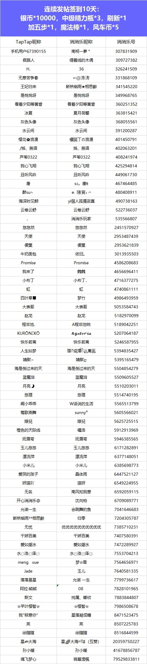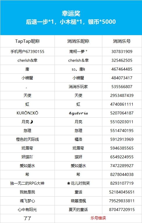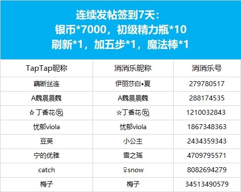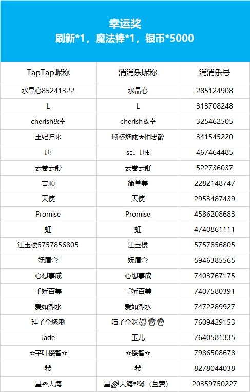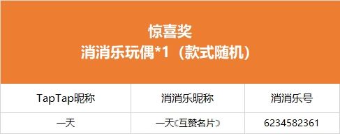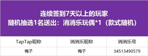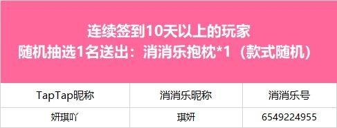 【年味起乐团圆,连签打卡庆新年!】活动现已开奖!恭喜获奖的各位小村民!本次活动道具奖励将在7个工作日内通过游戏进行发放,周边奖励将在30个工作日内发放,感谢您的支持与理解,之后也请多多支持消消乐(づ ̄3 ̄)づ╭❤※活动地址:https://www.taptap.cn/moment/504295721902539807