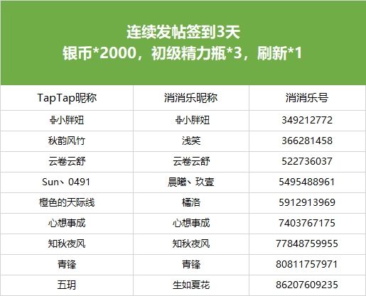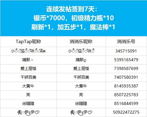 【假期打卡晒图,天数越多奖励越多!!】活动现已开奖!恭喜获奖的各位小村民!本次活动道具奖励将在7个工作日内通过游戏进行发放,周边奖励将在30个工作日内发放,感谢您的支持与理解,之后也请多多支持消消乐(づ ̄3 ̄)づ╭❤※活动地址:https://www.taptap.cn/moment/456424054266529548