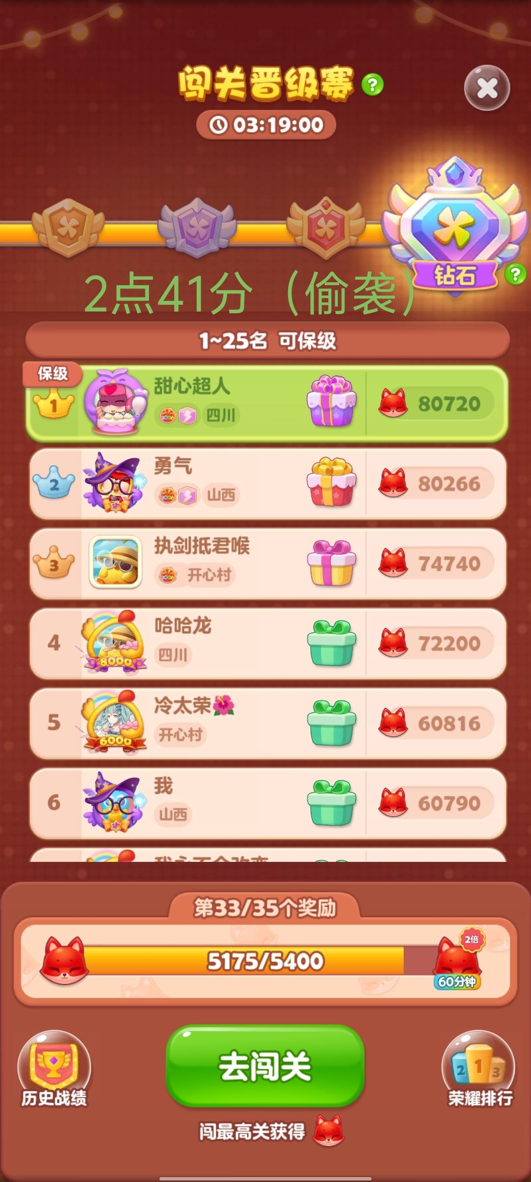 原本只肝了100来关,但晚上发现和第一名差得不多,就继续肝。谁知第一名也在跑,肝到12点半还差4000多狐狸,即使我设了个5点半的闹钟,还是无论怎么都睡不着,熬到两点又起来肝,终于把他送去见阎王了,之后我也睡不着,直到凌晨5点多确定他再无还魂可能,我才合眼。右号整个第140期肝了141关。这游戏恶心之处就是抓住玩家的好胜心,让玩家毫无底线地爆肝,甚至不惜