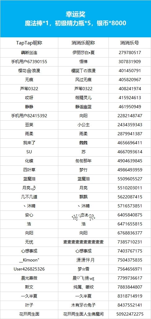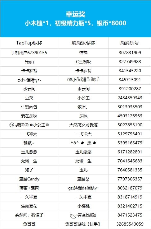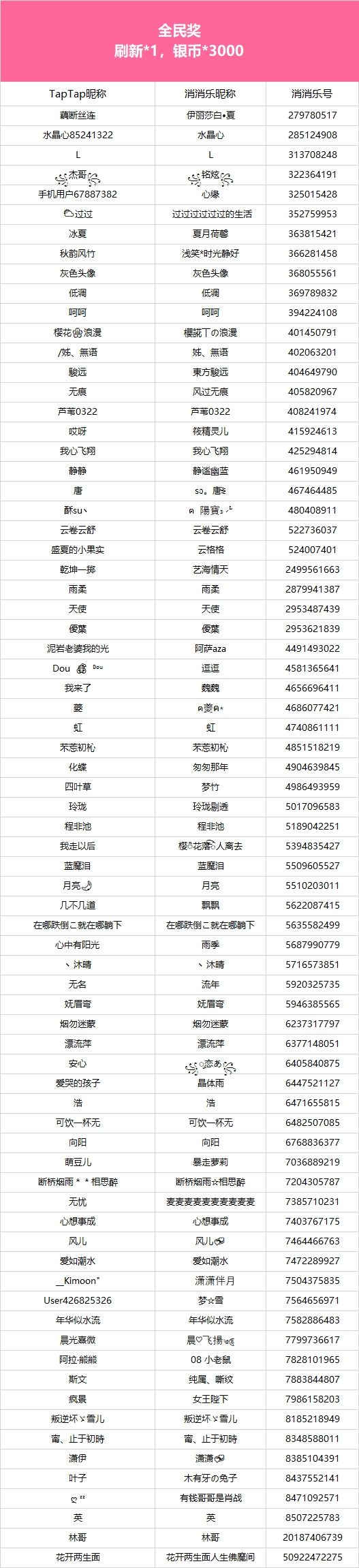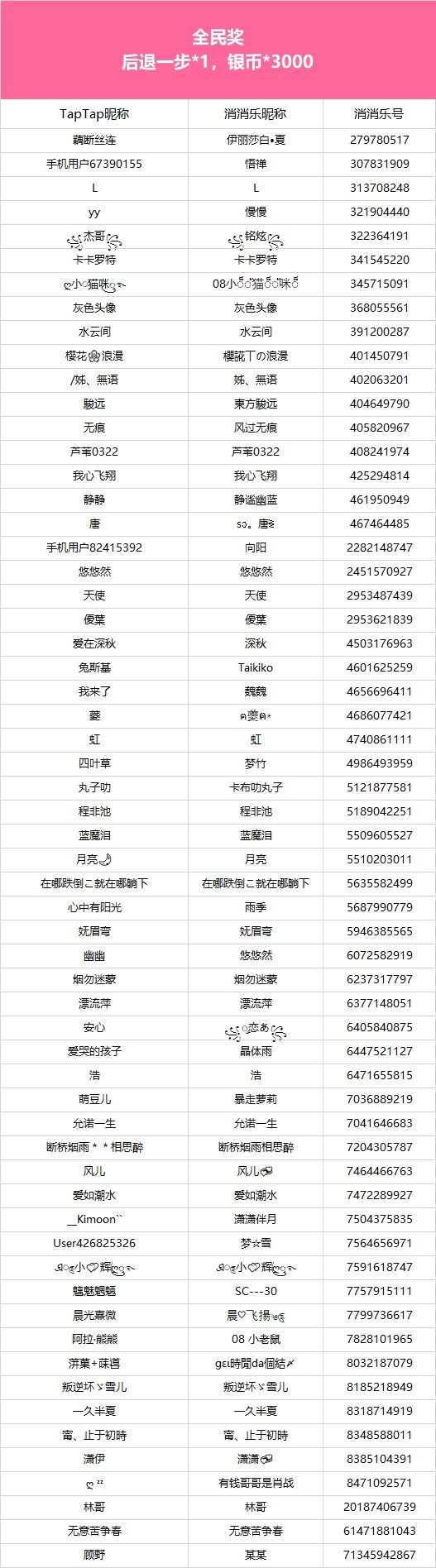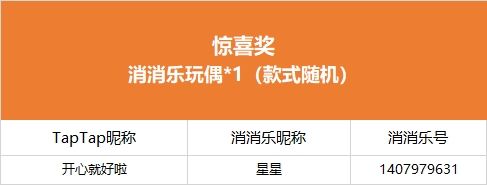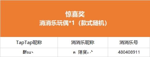 【重拾消消乐周年经典回忆】社区活动现已开奖!恭喜获奖的各位小村民!本次活动道具奖励将在7个工作日内通过游戏进行发放,实物奖励预计30个工作日内寄出,之后也请多多支持消消乐(づ ̄3 ̄)づ╭❤※活动地址:https://www.taptap.com/topic/20637709