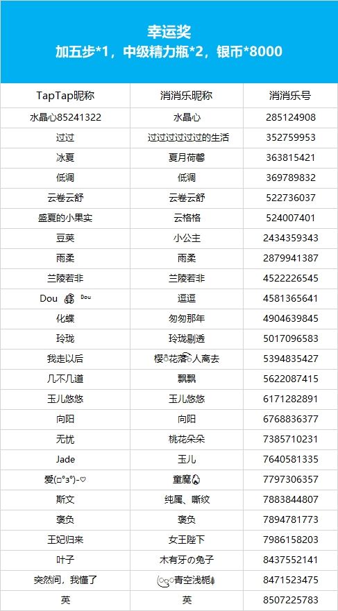 【展望周年,畅想未来!】社区活动现已开奖!恭喜获奖的各位小村民!本次活动道具奖励将在7个工作日内通过游戏进行发放,实物奖励预计30个工作日内寄出,之后也请多多支持消消乐(づ ̄3 ̄)づ╭❤※活动地址:https://www.taptap.com/topic/20691949