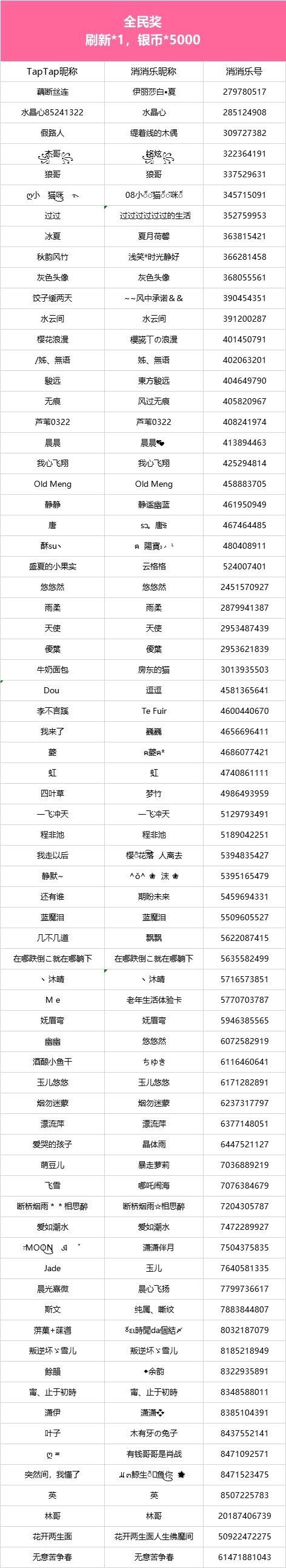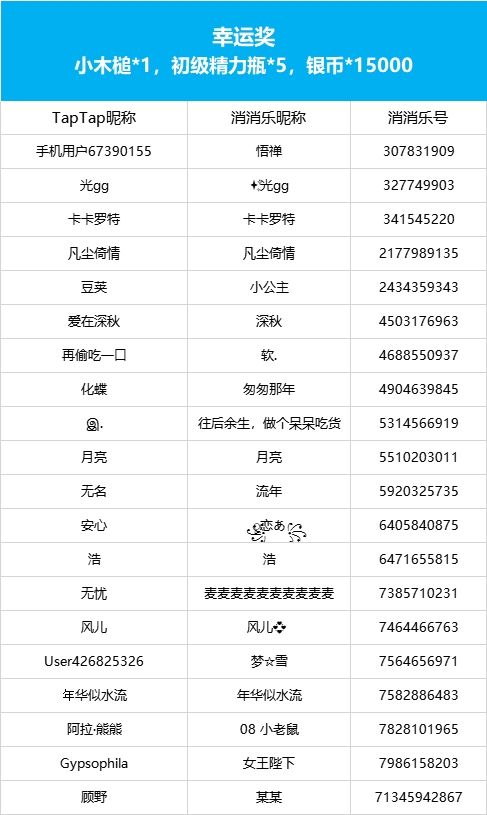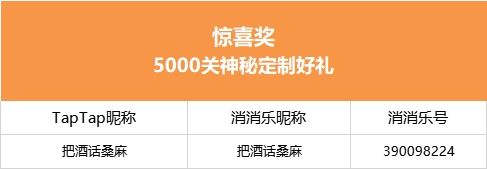 【开心消消乐突破5000关啦!】社区活动现已开奖!恭喜获奖的各位小村民!本次活动道具奖励将在7个工作日内通过游戏进行发放,实物奖励预计30个工作日内寄出,之后也请多多支持消消乐(づ ̄3 ̄)づ╭❤※活动地址:https://www.taptap.com/topic/20311617