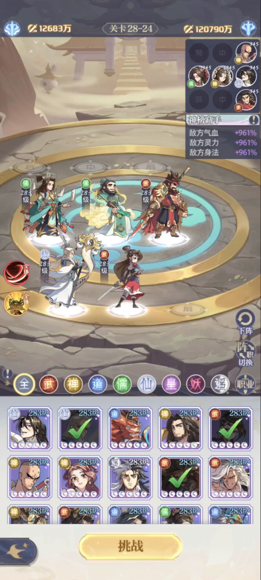 禅宗前期较弱,建议用上期的最强前期阵容过度。中后期发力,在一个多月时可以慢慢过度,后期戚继光和济公换吕洞宾袁天罡加容错率和打伤害,其他的达摩法海郭念君不变,因为吕洞宾技能释放需要80怒气,达摩灵器10级可以根据己方禅宗人数加开局怒气,起手2到3套技能非常香。平民微氪玩家后面可以用这套阵容当一队或者二队,实战效果很棒。又肉伤害又高。如果巨佬三队全仙皇可以略过