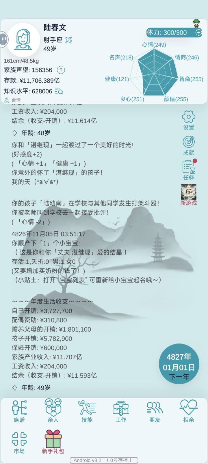 最重要的一点:天赋和基因越传承越少这点真的考虑一下吧,现在绝大部分群内版本或者去广告版玩家选择继承人时都会有意选择男性后代作为继承人,就是因为在这种天赋属性难以兼得的情况下男性主控可以生育更多后代,只要养得起一年生十几个都行,然后慢慢挑继承天赋/基因+属性好的来培养,这导致只能生一胎的女性主控几乎没有任何存在的价值,而且大概率从成年生到老死都没有一个合适的继承人,要么就是为了赶上年纪合适的继承人迫不得已四十岁就提前了结。