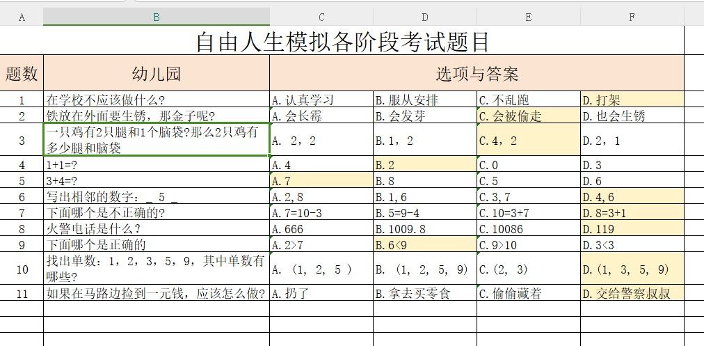 如题,玩了一段时间,我汇总了自由人生模拟游戏各阶段的考题,幼儿园、小学、初高中九科、大学以后的题都重复刷,特别是里面初高中的题,不敢说全部,百分之九十的题应该也有刷出来了。 (个别题目的答案明显与百度资料不一致的也有备注)