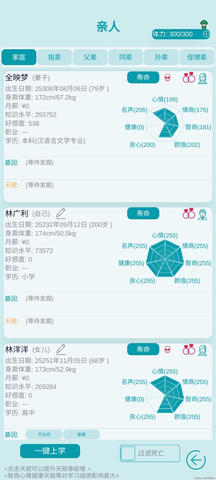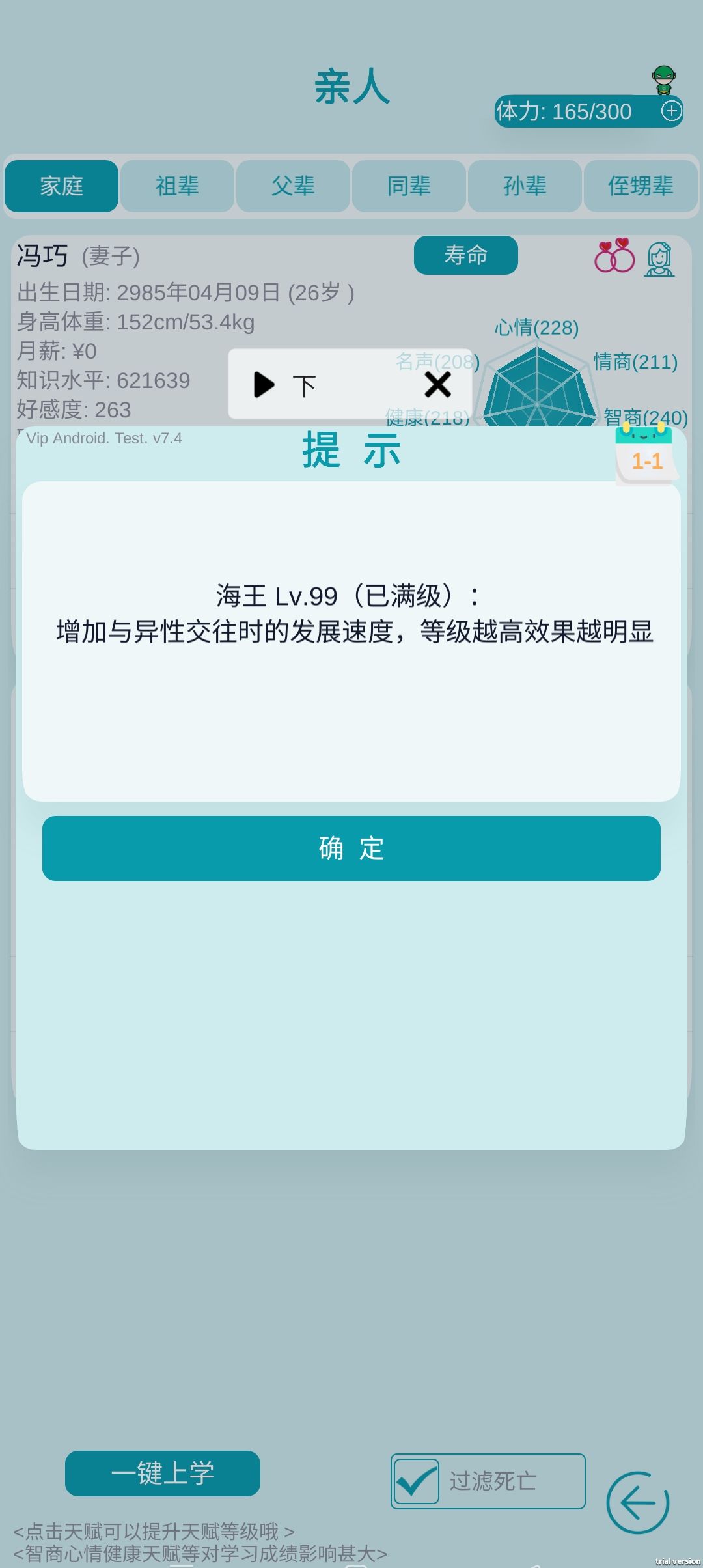 1.降低家族企业被破坏几率和维修费用 2.新增部分基因 3.优化考试系统(改为一张试卷考完所有题目,不然你们又要给我寄刀片了) 4.考试结束之后增加考试复盘功能 5.修复玩家子女在谈恋爱期间对方去世之后不能给孩子相亲的bug 6.修复”一键上学“未统计到成就和每日任务的bug 7.新增删除存档功能 8.新增部分成就和每日任务 9.优化族谱界面显示 10.主界面显示优化 11.开启新人生的时候删除之