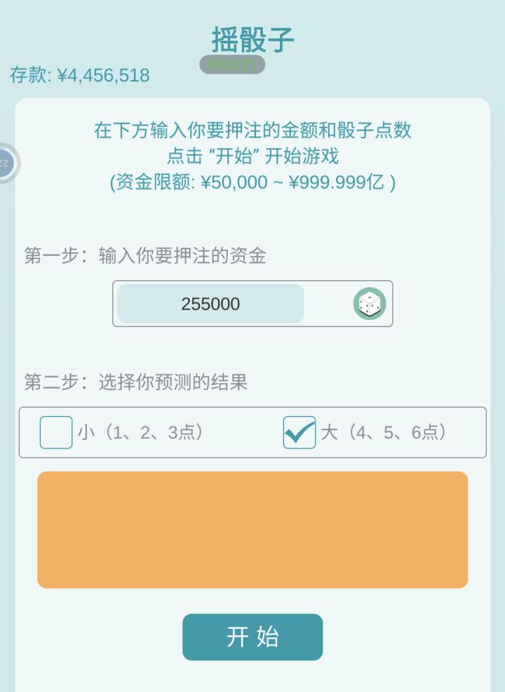 刚开始是想挣99个亿,想看研究所里面有什么东西居然要那么贵?通过攻略知道大家都是炒股,自己去尝试了一下,感觉炒股来钱很慢,总是挣不够99个亿,直到有一天刷到《六岁赌圣》的帖子,然后我也尝试去玩骰子,刚开始玩,没经验,看到老是输,心很痛,总担心钱不够,评论区里面有人说拿出总积蓄的1/13或者是1/20,一直买大,就可以短时间内实现经济自由,我就开始按照评论区里面的方法去做,果然来钱很快,我很快实现了