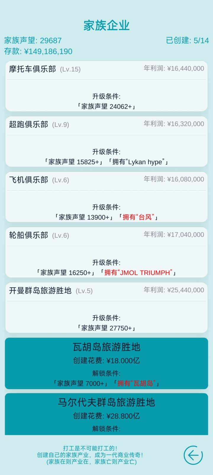 玩到现在也姑且玩了很久了,所以整理一下攻略。——目录——1.第一世职业推荐2.工资排行榜3.关于寿命4.关于满分5.关于sl6.关于转世分家产7.关于买股票——分割线——1.第一世职业推荐第一代努力学习高二选理科,大学专业选法医学,满级40级,后面就攒钱买家族资产开家族企业就ok。2.工资排行榜工作工资最高职业是摸金校尉月薪88w,淘沙义士月薪80w,奇门道士月薪73.6