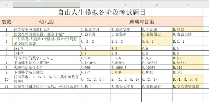 如题,玩了一段时间,我汇总了自由人生模拟游戏各阶段的考题,幼儿园、小学、初高中九科、大学以后的题都重复刷,特别是里面初高中的题,不敢说全部,百分之九十的题应该也有刷出来了。(个别题目的答案明显与百度资料不一致的也有备注)