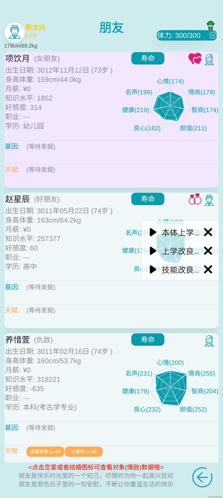 即使是99级花心,也会有被发现偷情的风险,一旦被发现,就是存款平分。不过结婚的好处是亲热只需要20点体力(每年30次),而情人的亲热需要25点(每年24次)。假如我想跟多位异性建立联系的话,就不适合结婚。但是不结婚又有可能触发情人的结婚请求,会有三个选项,第一个选项是跟她结婚,第二个选项是等等(不知道是什么效果),第三个选项我只是玩玩会导致她好感度降到负数关系破裂。最幽默的是前任交朋友邀请我