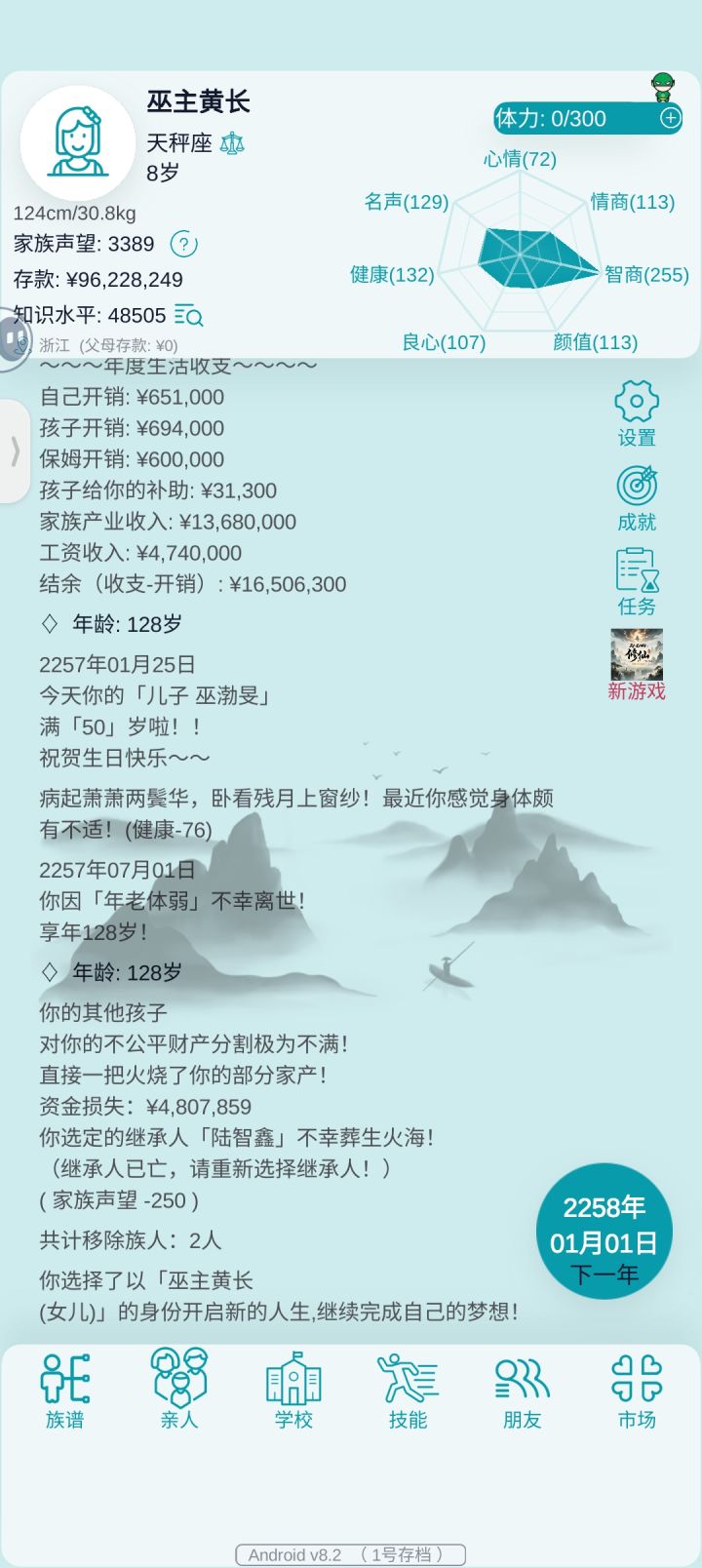 族长是个很冷酷的人,每次分财产都是继承人全部以至于回回都要死几个继承人。然后这一次,因为心水的是外孙,加上财产总和不少,所以分了另外两个子女一成,结果还是被烧死了。怒火中烧,把数值几乎完美但是没有天赋的50多岁次子、同时也是唯一尚在人世的亲子逐出族谱了。反正本来族长都已经好几代都是养子女了,也不在乎血脉了。不想发财产但是又没来得及花光钱的,可以把继承人以外的子女逐出族谱。ps:我还挺想试试没有