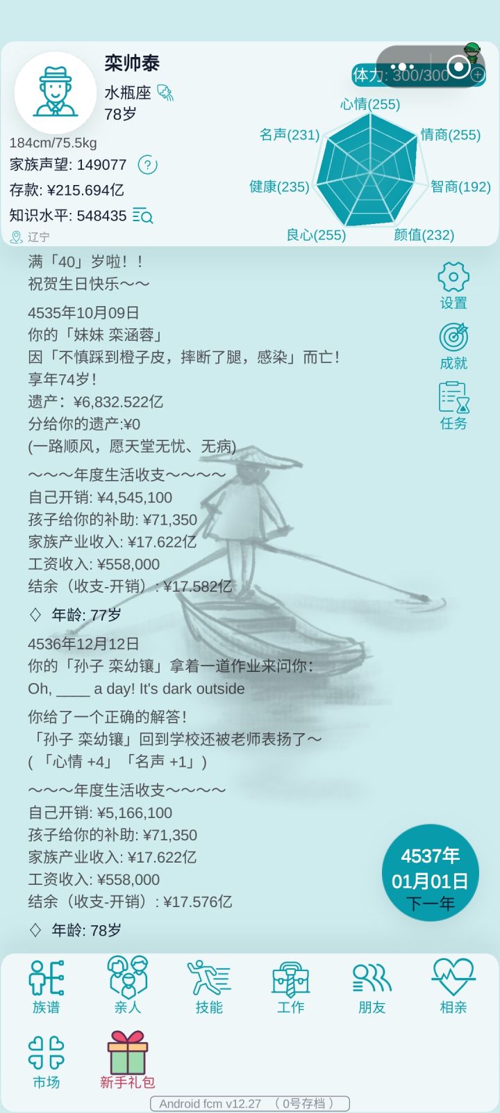 前中期快速刷声望家族企业有两个就可以了多养几个女朋友,不结婚结婚后养情人会被分家产,不推荐一直生孩子,不雇佣保姆送去读书总有几个会考满分刷声望孩子一多刷属性就很快(除了良心)体力就全部用来亲热,全怀了就再找一个一代人就刷了1w的声望年龄大一些就直接继承继承最好选年轻的,容易刷继承的时候把钱全部用来买房子,减少损失