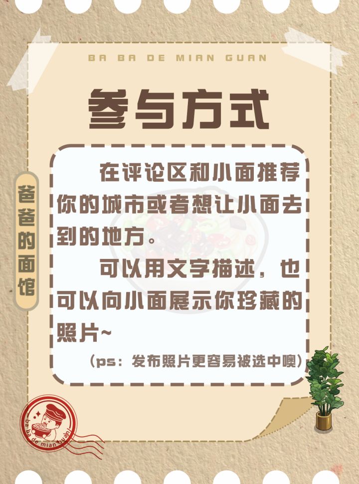 真的很羡慕!小面即刻出发!!开启一段特别的旅程(错峰版)首站目的地是研发大大(加班版)决定的!是面馆开始的地方噢~看!小面还特别设计了一张明信片给研发大大青春没有售价,小面直达你家~有董事长想要自己的明信片吗(左滑查看参与方式!)✅快给小面看看你五一拍的风景照吧,小面会抽取下一站旅行的目的地!被选中的董事长会有专属设计的明信片噢