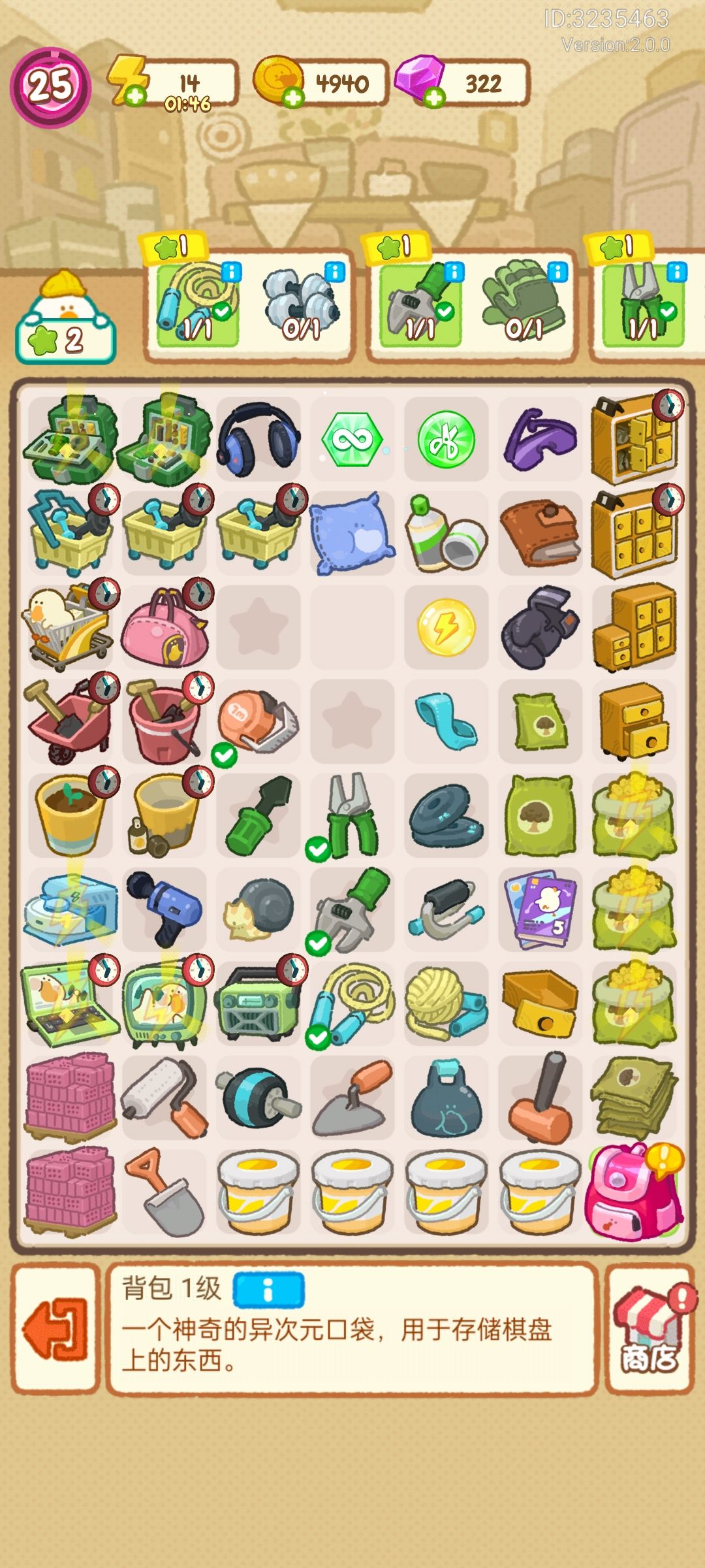 秀秀我的排列整齐的格子。 1.我最近就是总结了一点,就是花篮的编织绳这些素材不能够丢。 所有产出物的结构你都不能够丢。你比如说是把手,你比如说是花盆的泥胚。 以前的时候我都是老老实实的在等待包包里头产出,后来我发现花盆的泥胚还有把手,可以通过购物车出来。 就是等待这个物品升级之后,你就主动了,占据主动了。 他这个不好处是他会非常的占用你的格子的库存。 一旦他到了高级,他吐出来的东西不用一个一个的合成,你比如说我的工具箱升到第8级的时候,有的时候它会吐出三级的工具。你要是合成三级的工具会非常的费力。你从一级合成三级需要8个一级工具。 2.如果你要是没有钱了,就去做蜡烛9。把蜡烛酒给卖掉,就能够得到410块钱。你再去商店里头去买一些尘封的箱子,就可以产出物打配合了。 3.你可以丢一些产出的东西。 如果是升级,不需要用到蓝色的枕头的话,那你就大大方方的丢就可以,到时候再去现攒。 因为如果你想要一直留着他的话,会非常的耗费空间,然后你也没有空间去做一些其他的产品去升级。 注意你这种丢弃也是一个动态变化的过程的,比如说我昨天我还在丢枕头,然后我今天就开始攒枕头了,我想要去攒一些更高级的蓝色物品。 因为我今天得到了非常多的失物招领处,我有4个失物招领处,出产的速度就是足够惊人,可以供我升级用。 而昨天我只得到了一个失物招领处,他出来这个就会非常的占用格子。 4.如果做蜡烛做得很有钱的话,大概做三个9你就能够买下书包的一个格了。书包的一个格现在1000多,好心疼啊,我都没舍得买。 我的钱全都是在商店里头买一些尘封的盒子,然后想要嗯集齐卡片,然后升级。 5.最后一点就是要攒下咱的粉红箱子,还有黑色箱子,你要让他们合成,然后他们吐出的东西会更加的丰厚。 也有,我看有的攻略,他们要攒大肥鹅。就是把大肥鹅。先点上个十几下,然后把大肥鹅给留着。 小型是15下没有了,中型大肥鹅是18下没有了。他的策略是每次就点到只剩下一下。 到最后合成的时候合成一个金色大鹅。 6.他有一个就是金色游泳圈的一个游戏,你需要喂给他大老鼠还有大蜗牛,这个非常的耗费格子。 所以我喂了一次我就不再喂了。 因为我还需要集中力量去升级我这一些基本装备。 这就是我的心得体会。 7.他的活动里头我留下了石雕像。但是石雕像留了三个,我最后扔了一个。剩下两个实在是不舍得扔,但是他在那里也是占库存的。 嗯,蜡烛玩过一次就不想再玩了,玩蜡烛的时候其实就是为了卖钱。 同样夏日活动也是玩过一次,就不想再玩了。 现在我期待玩那个篮球赛。 8.那个你如何得到钥匙和拼图。 睡前呢,空出一大些格子来,一定不少于16个格子。16个格子以后,出产出来的最高级钥匙可以开启新的旅程。 不用的全都给扔掉。然后你在里面装满了,一级购物袋。到你第2天早晨起来,你就会得到一大堆的拼图还有钥匙,这种感觉太爽了。 一天玩一次 这样你的爽感能够保持到最高,如果你要一直持续的玩儿的话,接下来的时间你就是一直在匍匐前进,非常的难受。 因为就算是有的物品,它能够吐出零碎的物品也是非常的少的。你合成的速率他也是非常的少的。 玩游戏还不就是为了一个爽字吗?我在合成讲章的时候能够听到他的合成的声音是。朵瑞咪发嗦拉西的。这种感觉就特别好,就是你能够在里面体会到音阶的旋律。 9.还有就是你不要被游戏的卡片给牵着鼻子走。你升级健身房的器械是需要卡片的。比如他会要求你来4个失物招领处。 合成失物招领处,你就必须要去合成很多的储物柜,我当时是合成了6个储物柜,过了几天才合成的失物招领处。 这时候你合成了4个失物招领处,你不要卖他,你千万不要卖。 因为有4个失物招领处的机会千载难逢,你可以合成枕头U型枕。失物招领处往外头吐东西的速率非常的高,然后你可以很快的去得到筋膜仪和MP3,可以很快的去升级。 请赶快的升级,得到最高的收藏吧。合成的新的东西的爽快感,比升级还要高兴。 升级的快感比不上合成东西的。 10.一定要有自己的总结的策略,不能够什么都想要。 比如说。我很想要那个奖杯,可以从我的花篮里头产出,但是呢,在合成奖章的途中,特别特别的费格子。 不是说是把第9个奖章给卖掉,而是说保留第9勋章,不再去合成比他更低级的勋章。 这样下来我能够一下子空出15个格子来。玩游戏的爽感也会变高。 大家可以看看我这个26级和27级策略的变化。 11.无限能量的用法。 并不是说产出物就是无限的了,产出物该吐多少他就吐多少。不同的是在左上角能量的显示上。 比如说你左上角能量不足了,你可以使用无限能量,这样子它的能量总数不会减小。 12.现在我是非常非常的缺蓝色购物车。而且我还手贱,把它给合成高的了。级别高的冷却时间多。在商店里头需要去买素材。大概20多个粉钻一个素材。