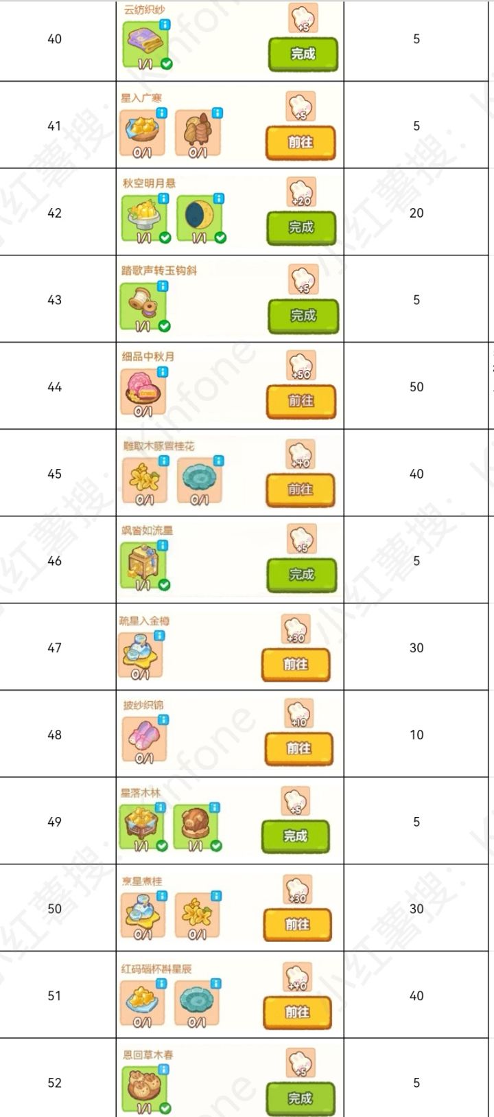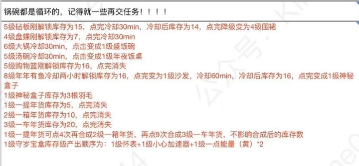 月圆中秋任务链(下):三线任务所有任务做完才能拿到所有奖励!!!没有循环任务。全部任务链加起来盘子数量:一级1个,二级3个,三级2个,四级4个,五级3个,合计95个一级盘子。月饼数量:一级1个,二级2个,三级3个,四级3个,五级4个,合计105个一级月饼;体力少的情况下:用粉兔子和灰兔子刷盘子最好,体力多的全部都点起来!!!