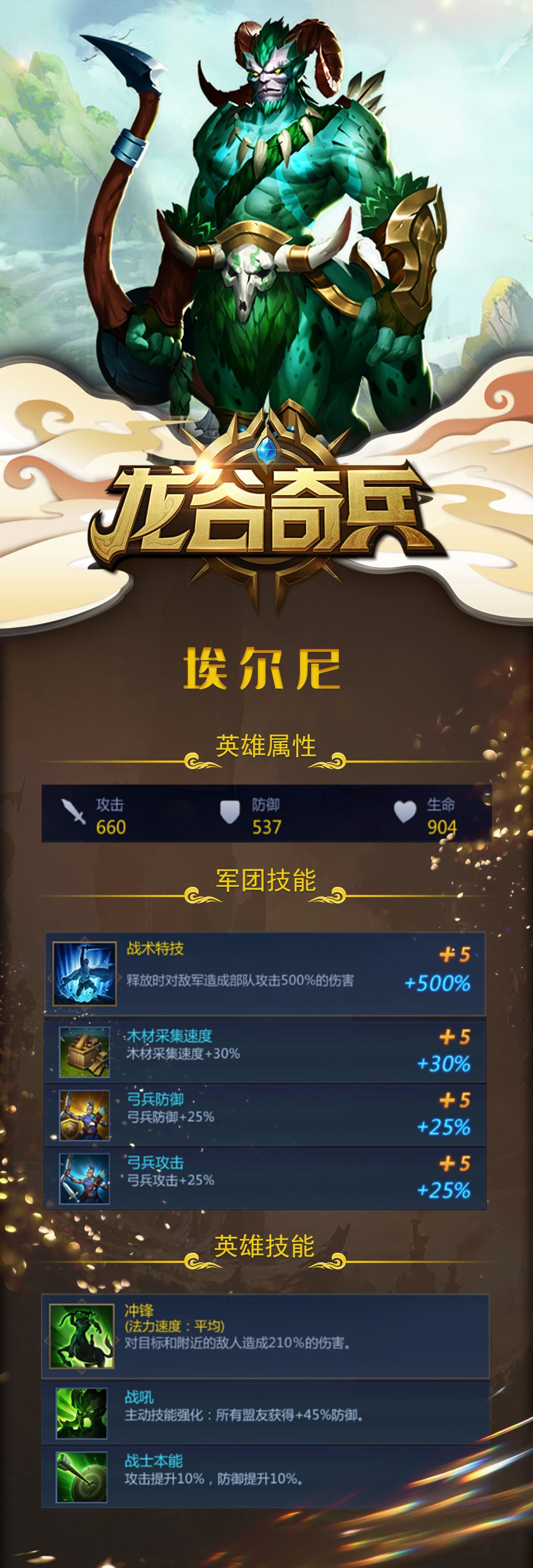大家好 欢迎来到本期英雄档案 这次的英雄是愤怨兽化人——埃尔尼 英雄最高强度预览 当亡灵军团入侵,驱动亡灵的扭曲能量也随之涌入世界,扭曲能量分散经由极地风吹向世界各地,一些接触到能量风暴的生物被破坏性的扭曲能量干扰,突变成非人非兽的怪物,这些即是恶兽,其中文明生物的突变体则被称为兽化人。 多数兽化人为人类的突变体,外貌神似有着山羊头人类身躯的怪物,牛头人以及其他种类的突变外貌则较为少数。除了人类外