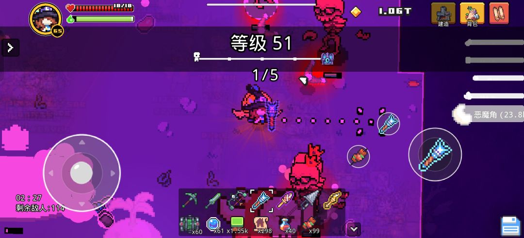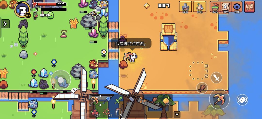 初始阶段需要用稿子到处去采集资源,这个阶段比较辛苦,但是乐趣也比较多。第一次解锁的沙漠迷宫,boss还有点打不过,都是卡在门口用弓箭赖死的。前期可以靠这个boss刷点克服之证,提升等级或者血量。拿到雷电法杖之后,游戏性质就完全不一样了。中期阶段刷资源不再需要稿子了,雷电法杖一顿突突就好了。这个时候需要解锁墓地的迷宫,里边找到献祭台通过卖血获得机器人和升级。这里就建议现在沙漠迷宫刷点克服之证,熟练以